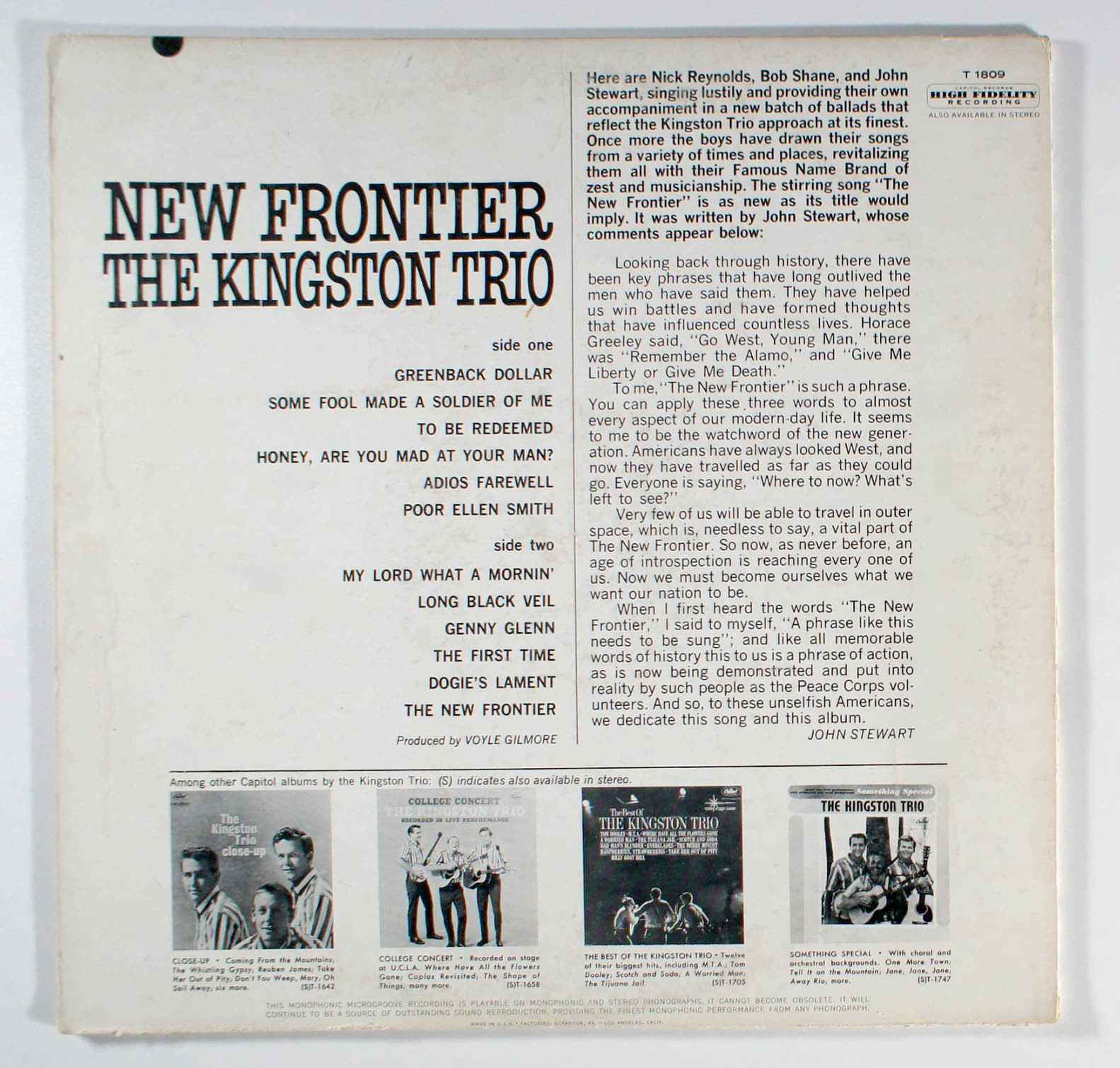 New Frontier, by Kingston Trio, reached No. 16 on the Billboard Pop Albums chart. The lead-off single was Greenback Dollar b/w New Frontier.