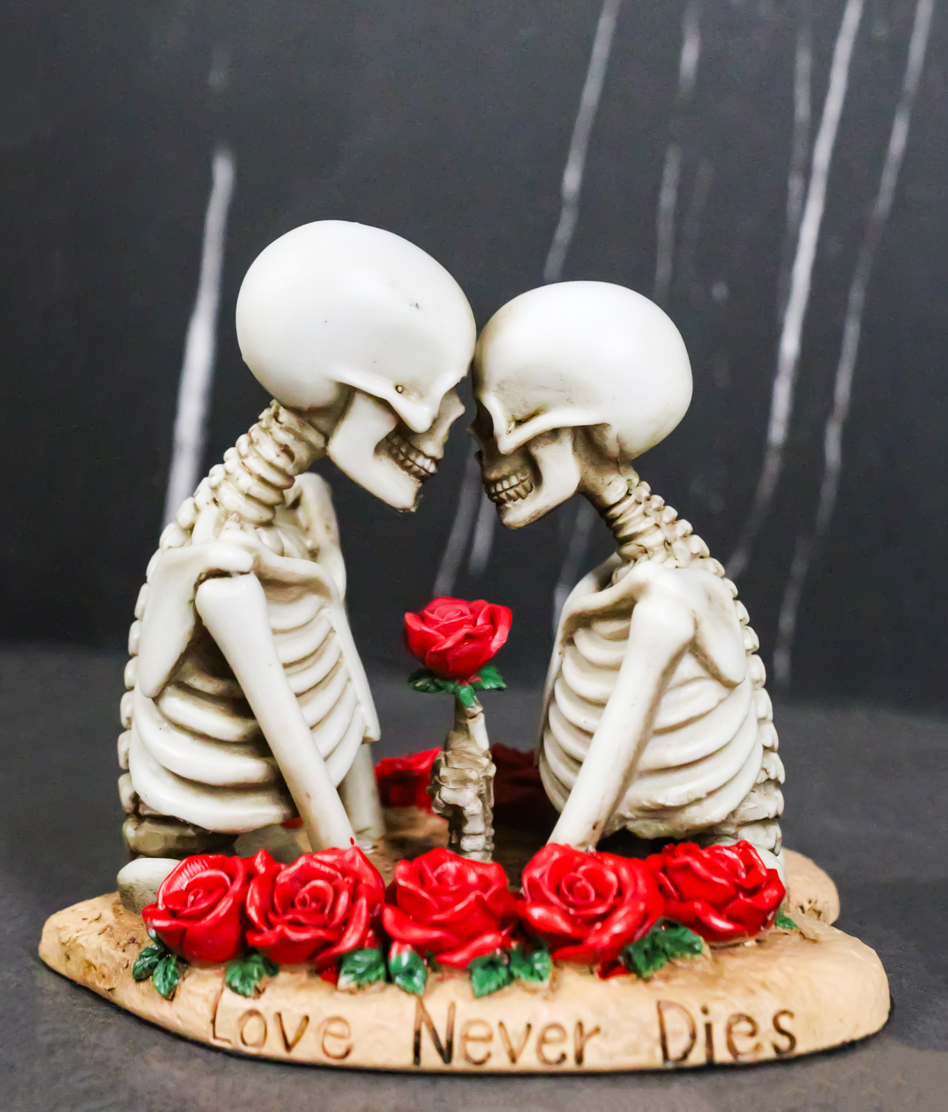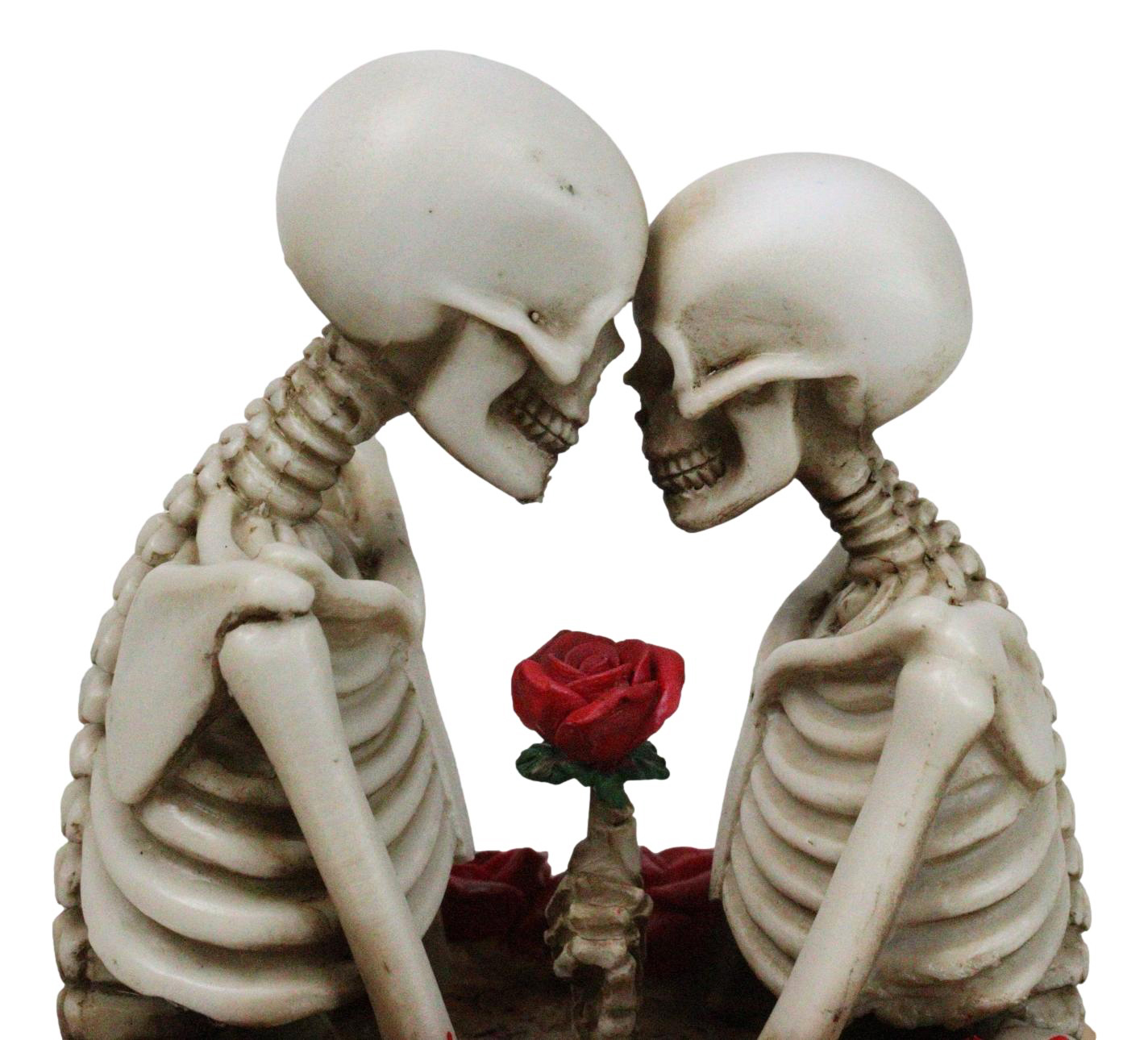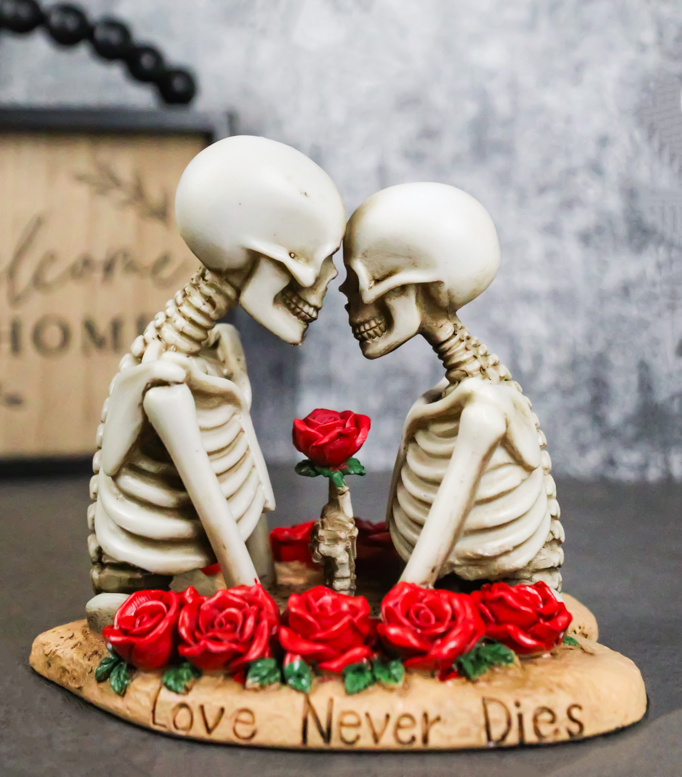 ? Celebrate everlasting love with our "Love Never Dies" Skeleton Couple Statue, beautifully crafted to depict a touching bond between two skeletons holding a delicate rose amidst a bed of vibrant red roses. This enchanting piece captures the essence of love that transcends even the boundaries of life, making it a perfect addition to any romantic or gothic decor. Ideal as a heartfelt gift for anniversaries or special occasions, this statue serves as a stunning reminder that true love never fades.