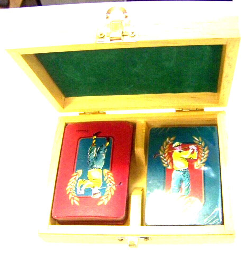 NEW!! Wood Box Set of Golfer Playing Cards Box and 2 Sets of Cards, FREE SHIP!!