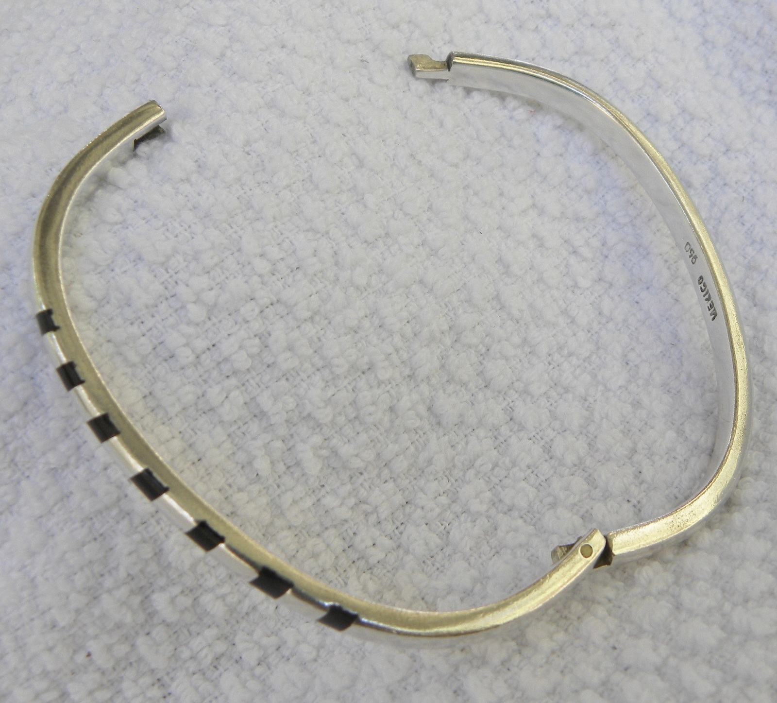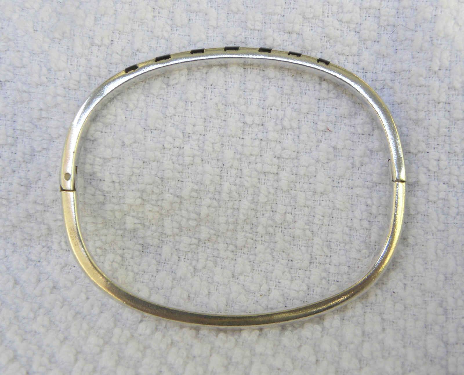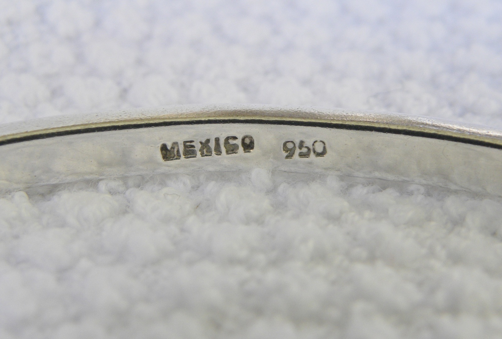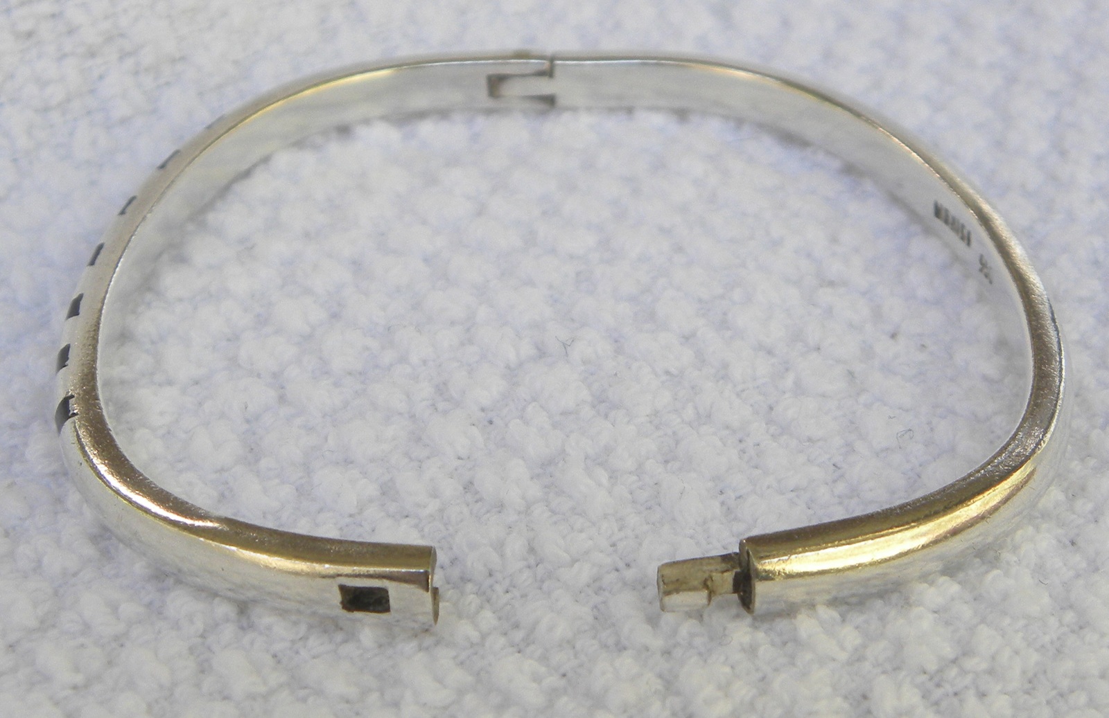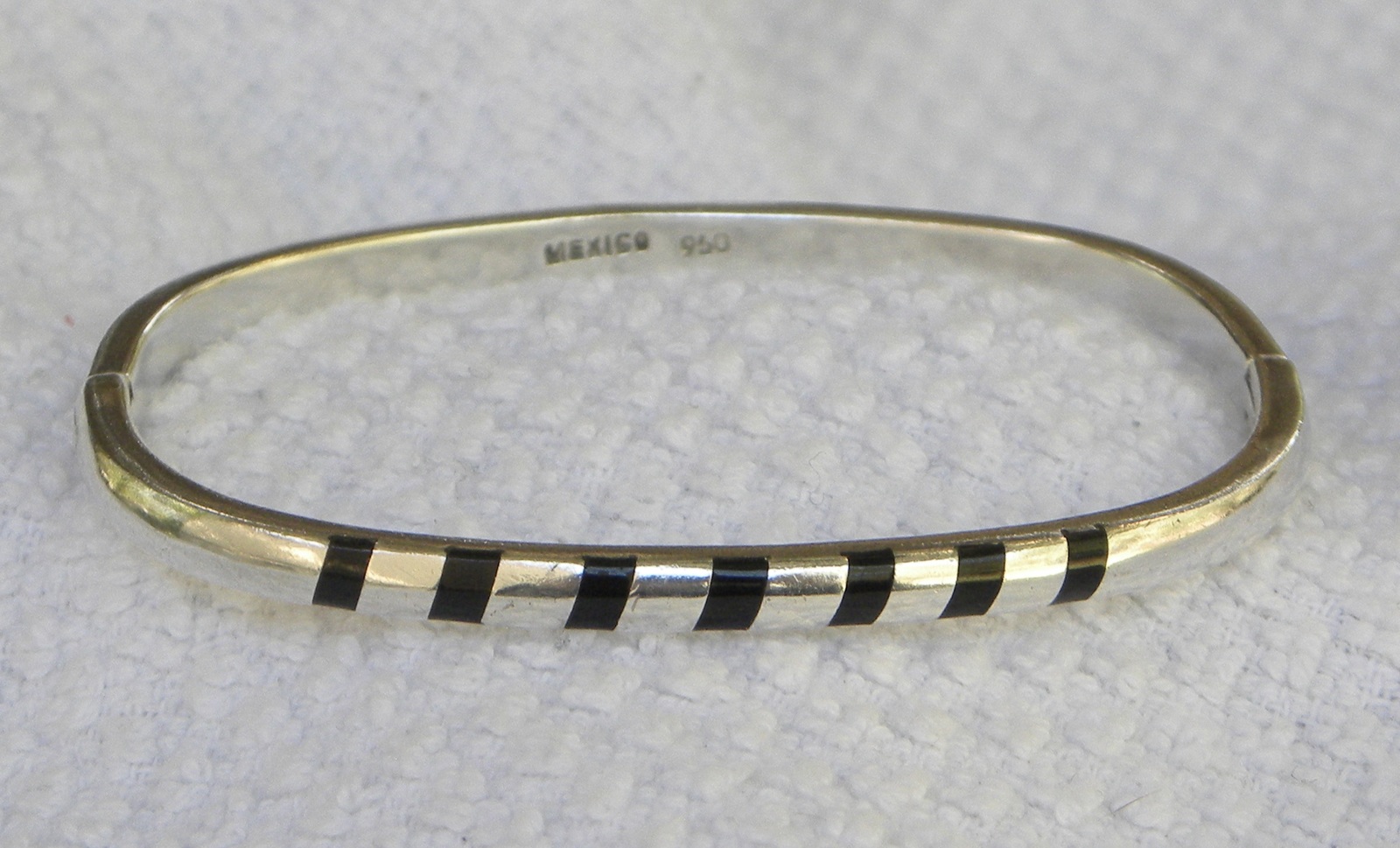 For Sale: Vintage Mexico Sterling 950 Silver hinged bangle Bracelet. Inlaid Onyx. 22 grams. Marked Mexico- 950.