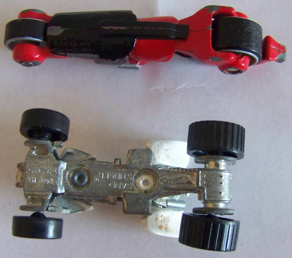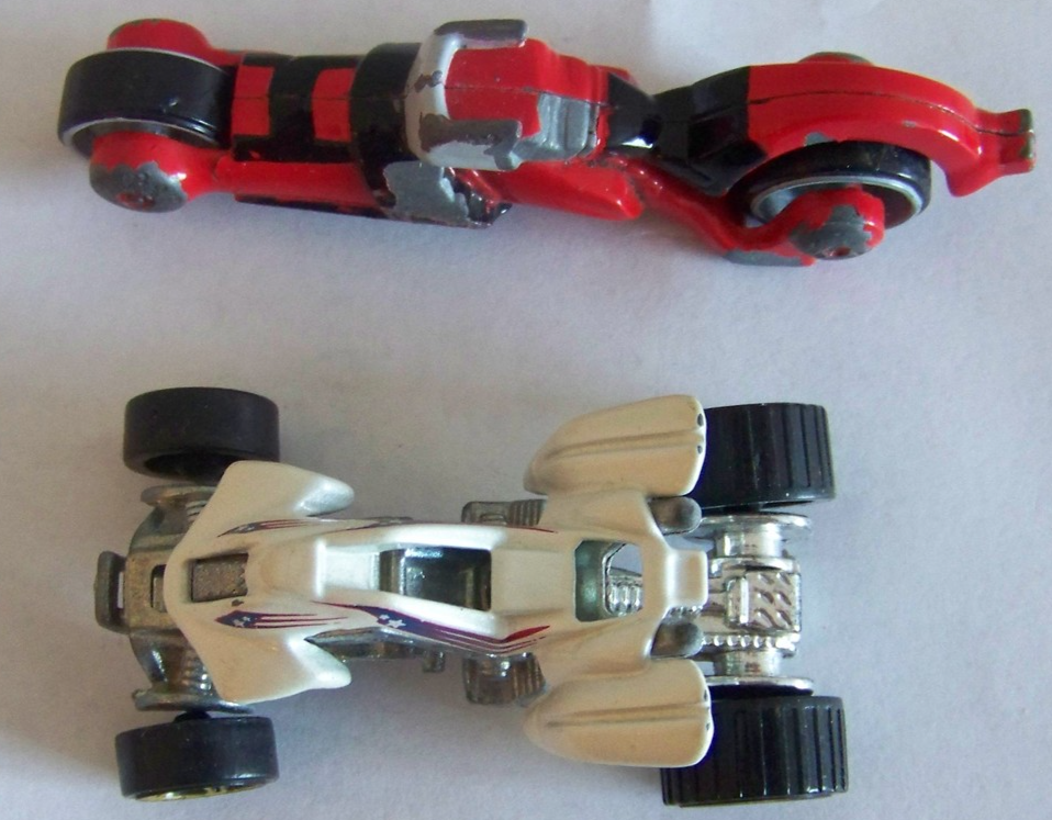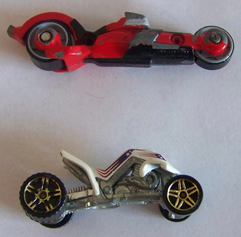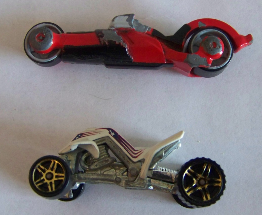 RED MOTORCYCLE MADE FOR MCDONALDS 2012, ABOUT 3 1/8" LONG, WHEELS STICK ON THIS ONE. 2002 SAND STINGER ROLLS NICE. BOTH SOLD AS-IS NO RETURN.