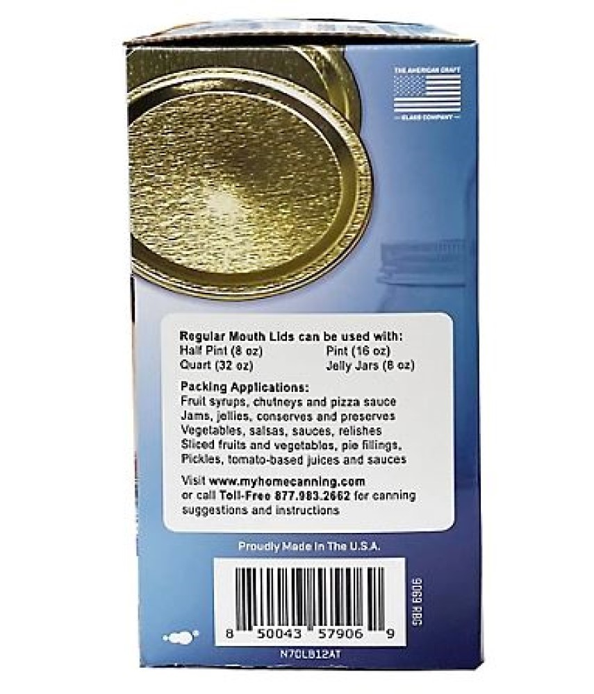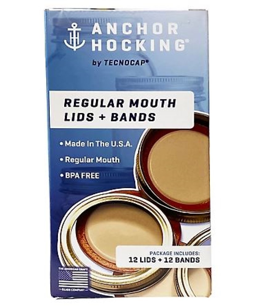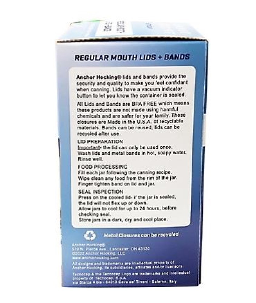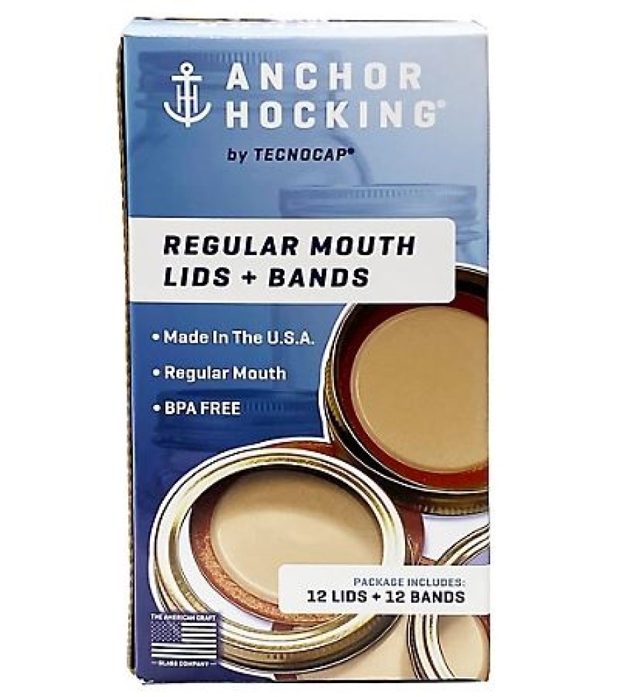 Keep your foods freshly preserved with the Anchor Hocking Regular Mouth Bands and Lids. Compatible with all Anchor Hocking and Ball regular-mouth glass mason jars, these canning jar lids offer the sealing quality that canners have trusted for generations, ensuring no oxygen gets into the canning jar so your food remains preserved just the way you created it. Whether you're preserving jam to enjoy for long periods of time or storing freshly made salad dressing for the coming week, these mason jar caps seal in freshness to keep your food tasting great. These metal mason jar lids and bands are BPA-free and made in the USA. When canning, lids are for one-time use only.