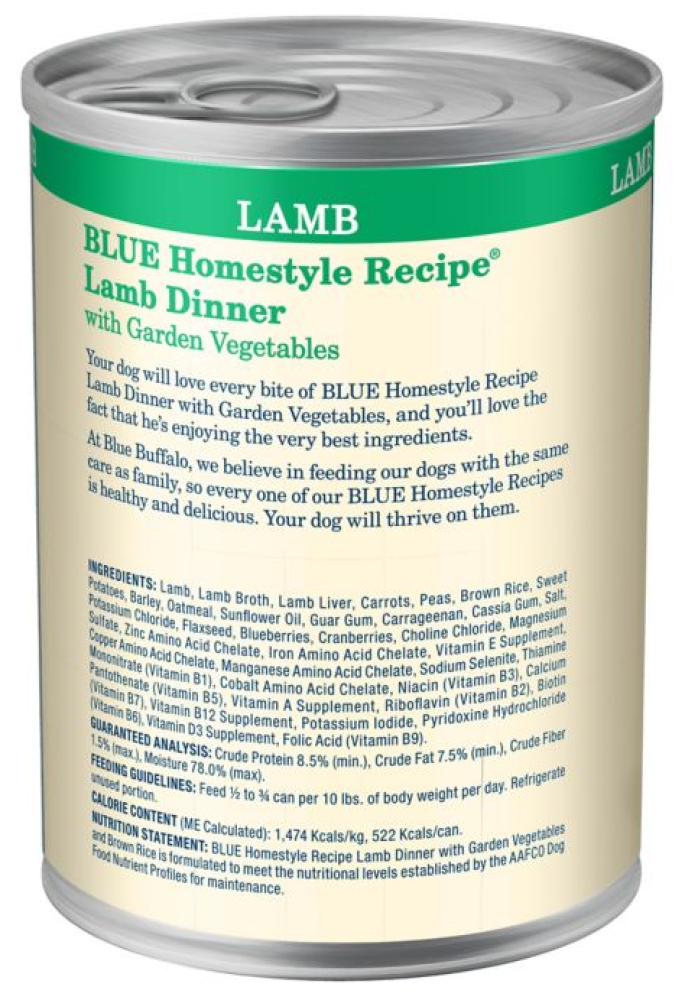 REAL LAMB FIRST: This pat style wet dog food features high-quality protein from real lamb to support healthy muscle maintenance FEED THREE WAYS: BLUE Homestyle Recipe adult dog food makes a delicious treat, adds interest mixed into their favorite dry foods or can be fed as a meal on its own NATURAL DOG FOOD: All BLUE canned dog foods are made with the finest natural ingredients and enhanced with vitamins and minerals WHOLESOME INGREDIENTS: BLUE wet dog food contains NO chicken (or poultry) by-product meals, NO corn, wheat (a common thickening agent used by other brands) or soy, and NO artificial flavors or preservatives Contains one (1) 12.5 oz. can of BLUE Homestyle Recipe Natural Adult Wet Dog Food, Lamb