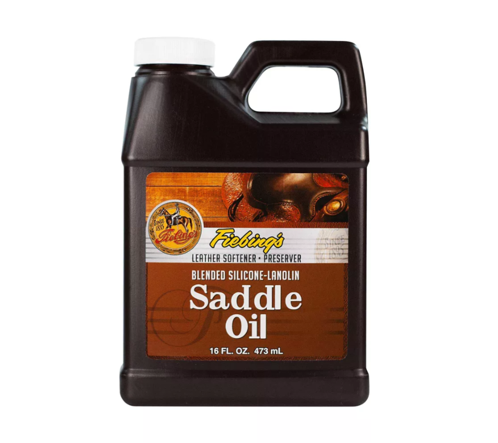 Fiebing's Silicone-Lanolin Saddle Oil contains lanolin that keeps leather pliant and silicone that repels water