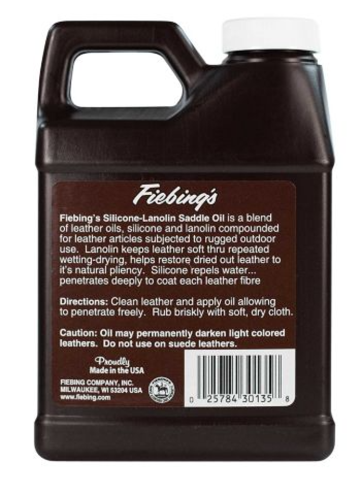 Fiebing's Silicone-Lanolin Saddle Oil is a blend of natural oils that is fortified with lanolin and silicone that preserves, protects and lubricates smooth leather items subjected to rugged outdoor use. Fiebing's Silicone-Lanolin Saddle Oil is best for use on saddlery, hunting boots, work shoes and smooth leather athletic goods. Fiebing's Silicone-Lanolin Saddle Oil contains lanolin that keeps leather pliant and silicone that repels water.