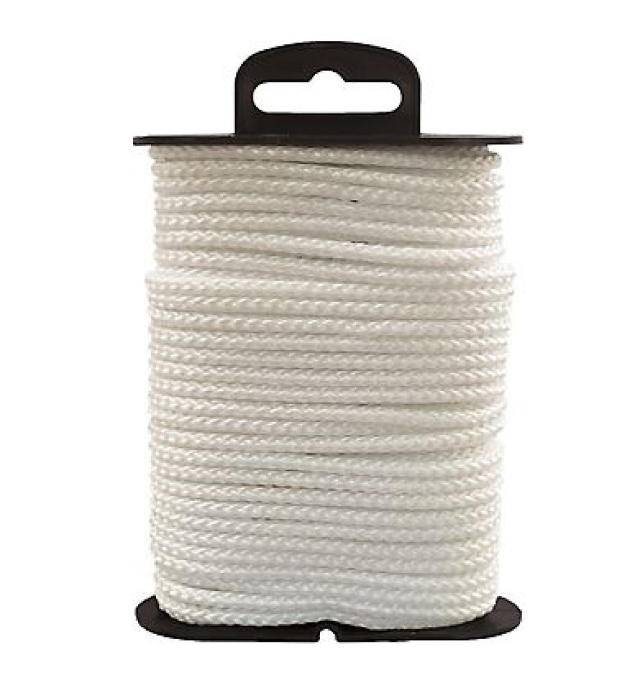 Diamond Braid cord, 1/8 Diameter x 48 feet. Knots securely. Resistant to abrasion. Can be stored wet or dry. Resistant to oils, most chemicals, rot and mildew. Working load limit 45 lbs.