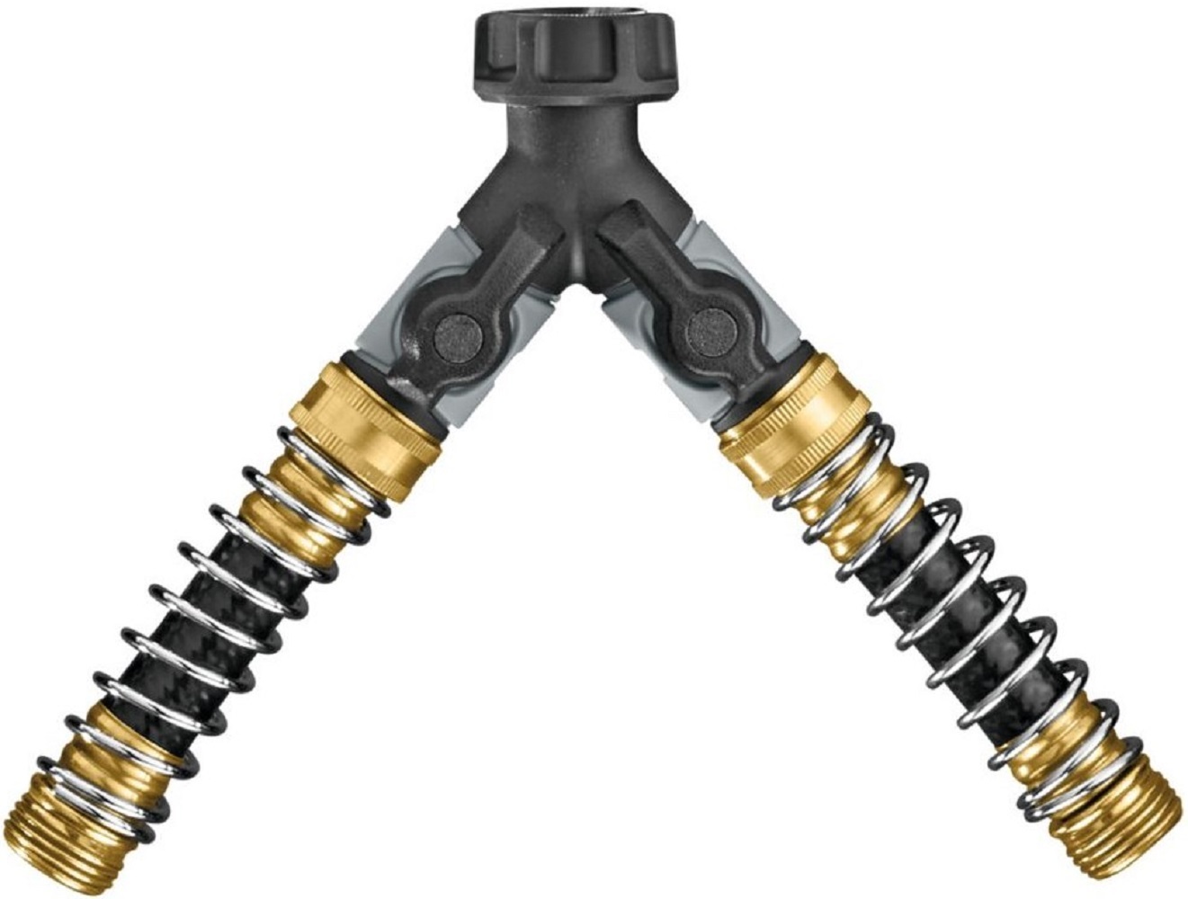 Orbit metal hose converts one faucet into two Flow control/shut-off levers Flexible outlets for kink free operation Metal hose Y's heavy-duty construction with leak-free ball valve ensures quality performance For cold water outdoor irrigation use only
