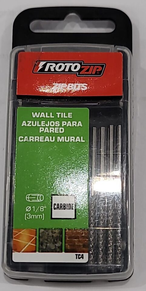 Tile Cutting Bit, Drill Bit Diameter 1/8 in, Max. Speed 33,000 RPM, Shank Diameter 1/8 in, Overall Length 2 in, Bit Application Tile, Primary Material Application Cement Board, Ceramic, Plaster, Material Tungsten Carbide, Tip Style Cutting, Flute Length 3/4 in, Cutting Direction Right Hand, Number of Flutes 1, Cutting Depth 3/4 in, Tool Brand Rotozip, Package Quantity 4