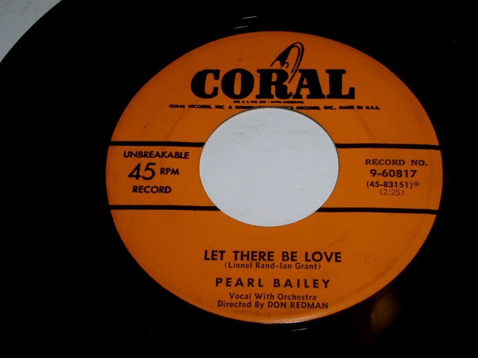 This is a vintage 45 rpm phonograph record by Pearl Bailey entitled, "Let There Be Love". Flipside: "Takes Two To Tango". Record label Coral 9-60817.