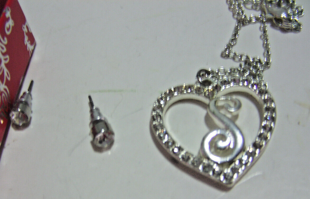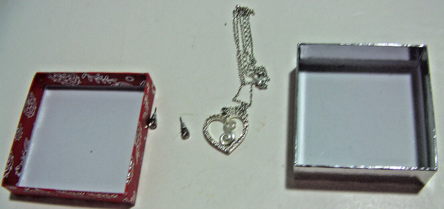 USED!! "S" Silver Heart Necklace & Pierced Earrings Set, FREE SHIPPING US ONLY!!