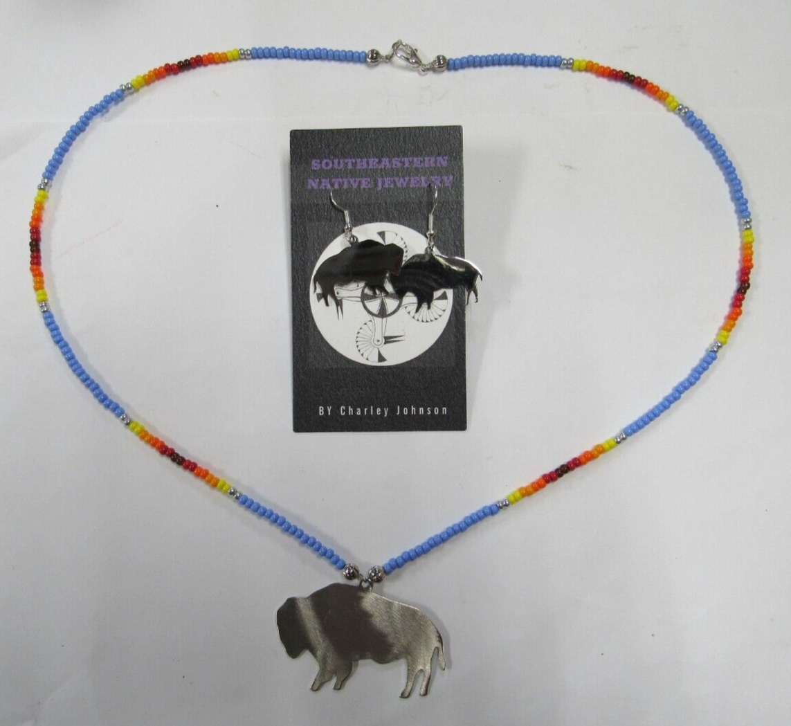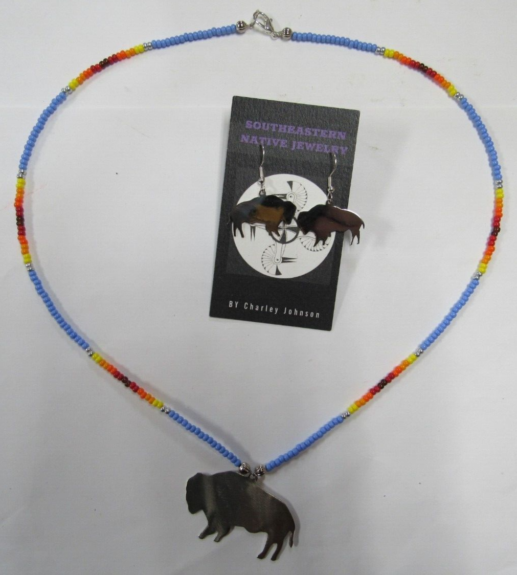 Here at Debi's Attic Gold in Wewoka, Oklahoma we have a New Native American Beaded Buffalo Necklace and matching Earrings Handmade by Charley Johnson, a local Seminole Tribal Member. Charley has won several Art shows with his work, including the Chickasaw Artesean Art Festival 2023! He is also the Nephew of Lewis Johnson Chief of Seminole Tribe here.