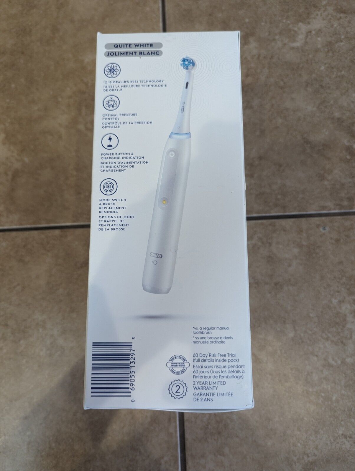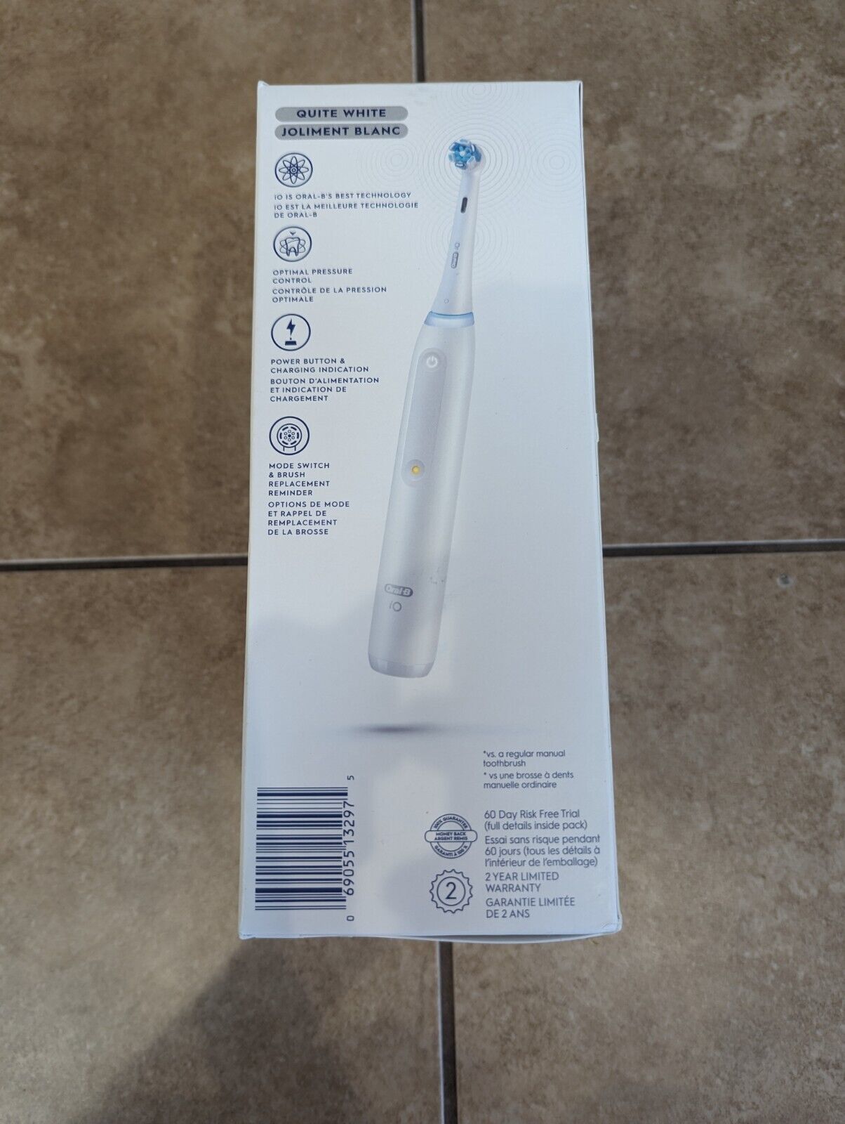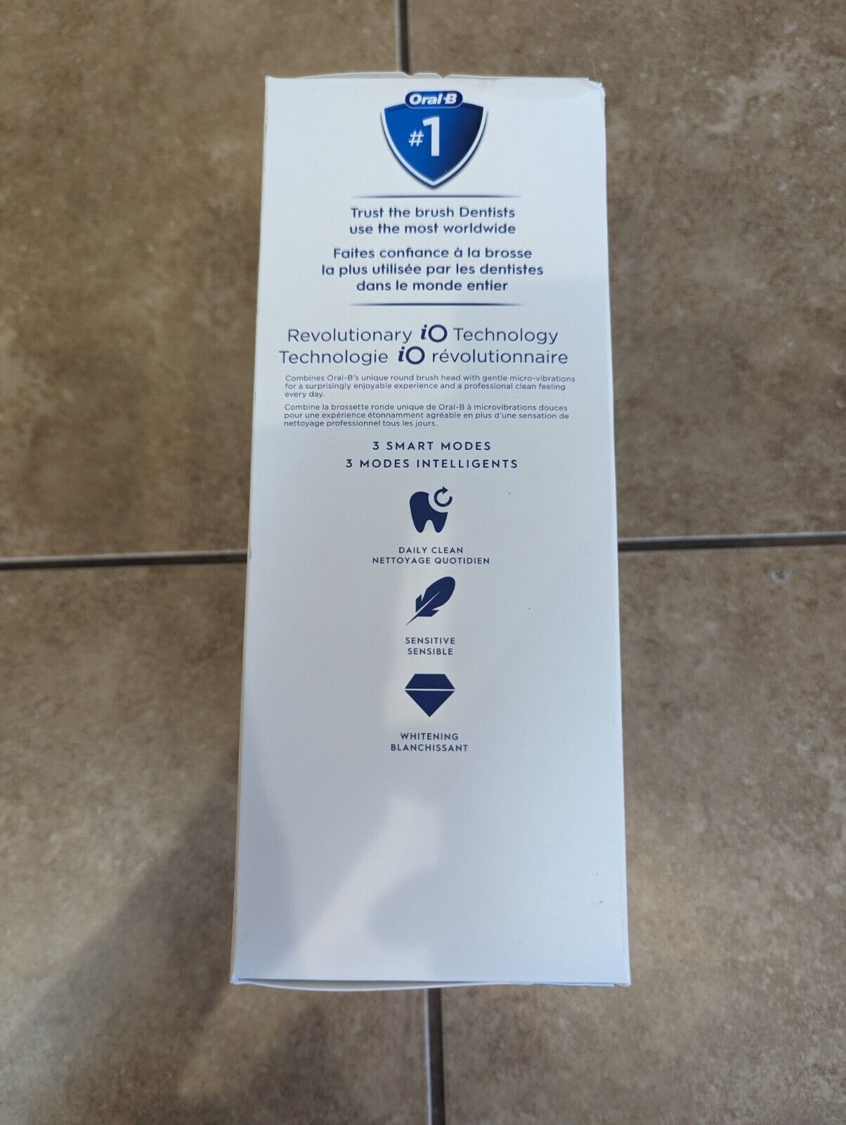 The iO is Oral-B's best technology: Clinically Proven 400% More Plaque Removal Along Gumline versus a regular manual toothbrush. A Round head and gentle micro-vibrations, the Magnetic interaction delivers smooth, harmonious motion through a Synchronized cleaning action (micro-vibrations synced with oscillations). A Built-in-2-Minute Timer ensures an even easier experience, helping you get an optimal clean on all your teeth. The Oral-B's quadrant timer breaks the two minutes up into four 30-second intervals to clean each quadrant of your mouth; we keep the time, so you don't have to. Delivering the perfect pressure is done by having a Pressure Sensor. The Pressure Sensor Indicates optimal cleaning pressure and warns of over pressure. With an accompanying travel case, you'll have a fresh clean everywhere you go. We're with you on your next trip or even your mid-day on-the go brushing! Best of all, it is brought to you by Oral-B-the #1 brand used by dentists worldwide.* *Based on surveys of a representative worldwide sample of dentists carried out for P G regularly. Do not use on children under age 3. Replace brush (head) every 3 months or sooner if brush head becomes worn.