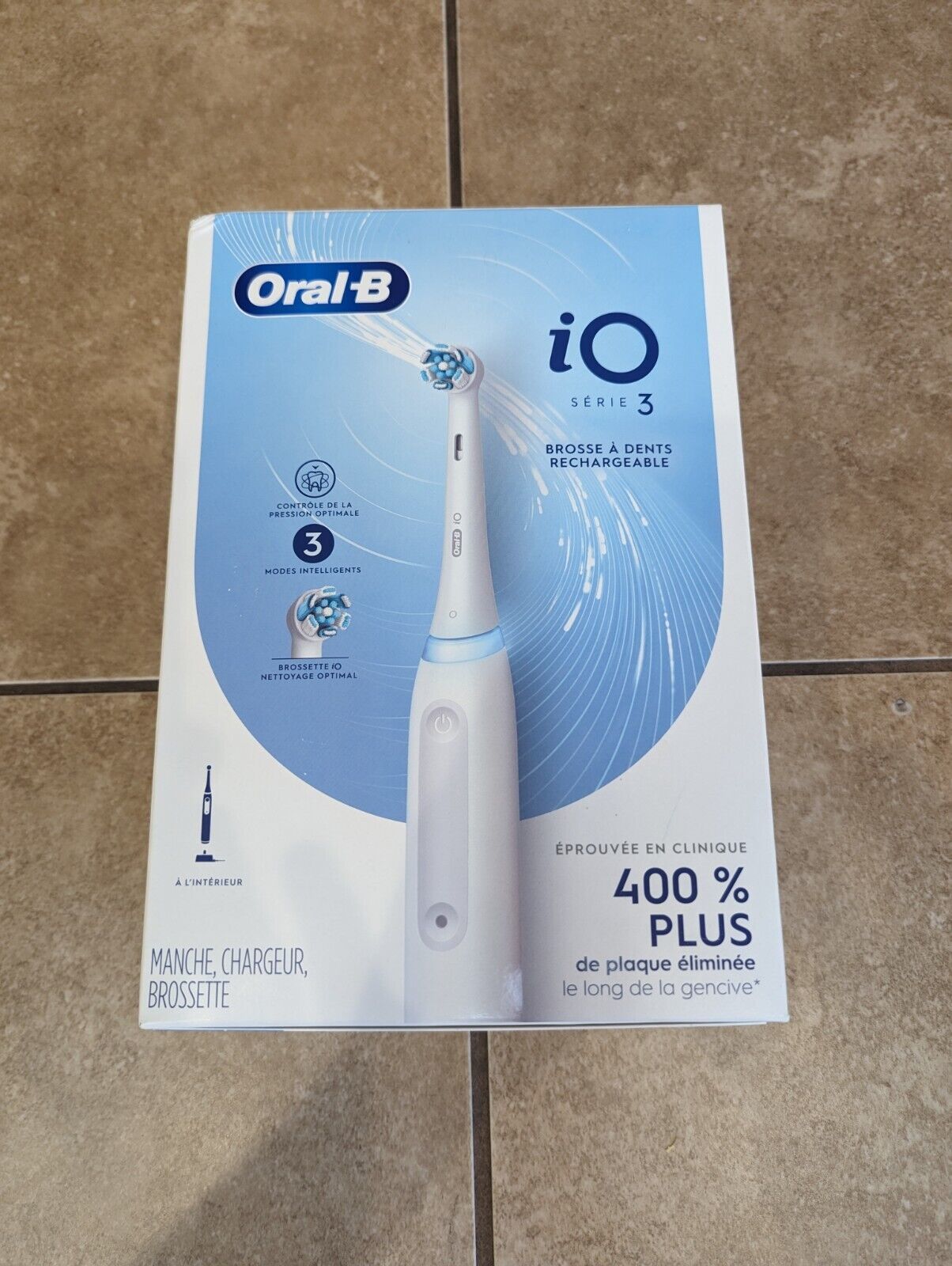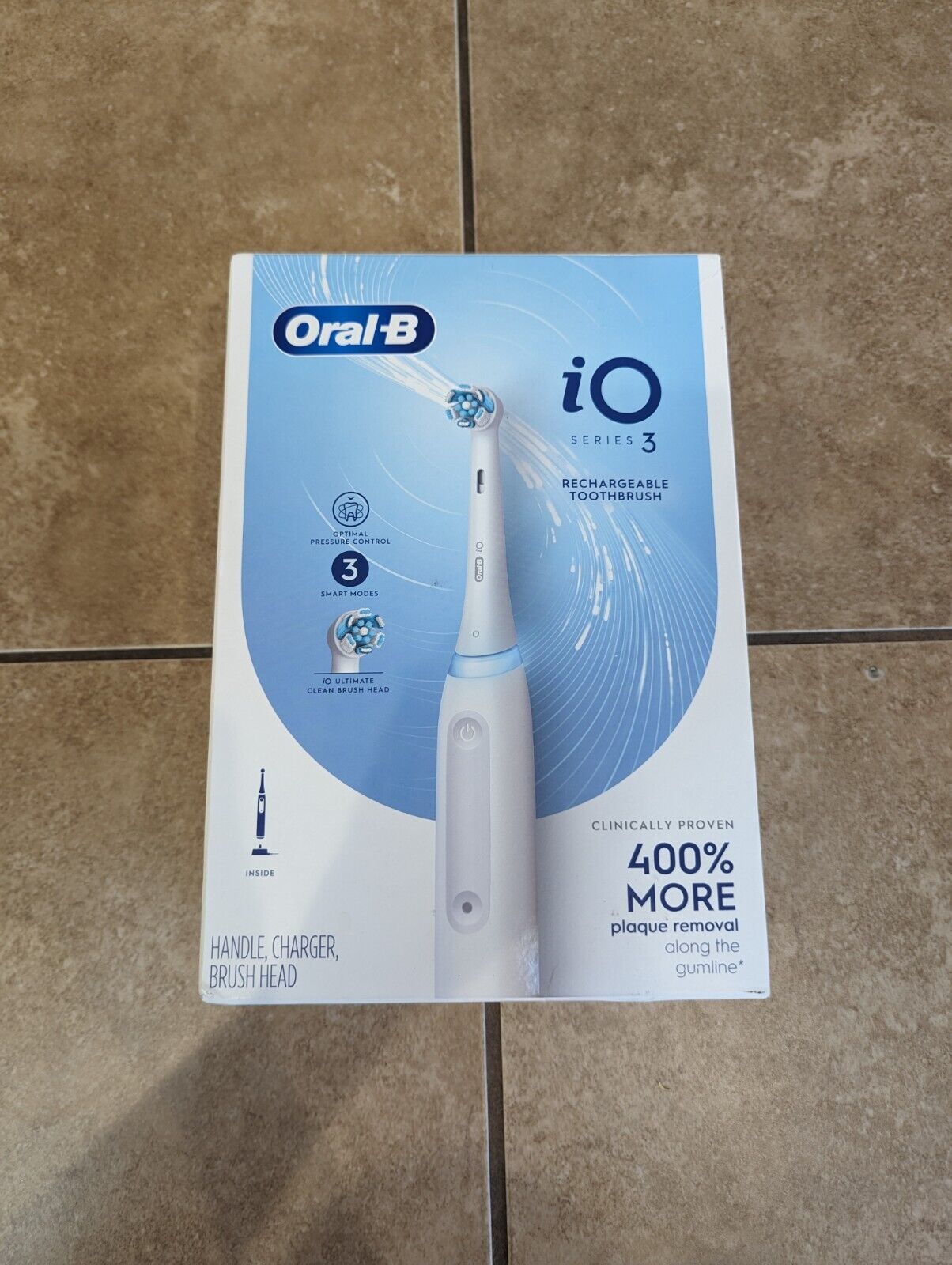 You will receive (1) Oral-B iO3 Electric Toothbrush, (1) Ultimate Clean Replacement Brush Head, and (1) charger Clinically proven to remove 400% more plaque along the gumline vs. a regular manual toothbrush 3 Smart Modes for personalized brushing: Daily Clean, Whiten, Sensitive Includes a 2 minute timer to ensure a complete clean Pressure sensor indicates optimal cleaning pressure and warns of over pressure Round head and gentle micro-vibrations Oral-B:Trust the brush Dentists use the most worldwide
