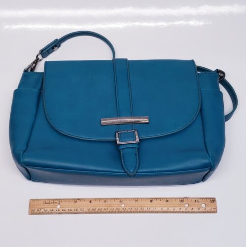 The "Damsel in Defense DAPHNE Concealed Carry Purse" is a stylish and functional shoulder bag crafted from teal green vegan leather. It features a solid pattern with silver hardware accents, including a buckle, strap, zipper, and logo. The bag includes a magnetic and buckle closure, microfiber lining, and adjustable shoulder strap in teal. Designed for women, this medium-sized crossbody bag from the DAPHNE concealed carry collection by Damsel in Defense offers inner and outer pockets, dividers, and a classic yet practical design.