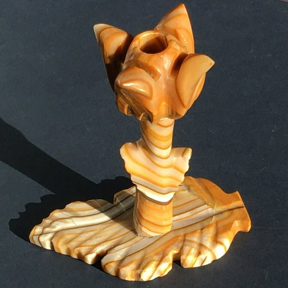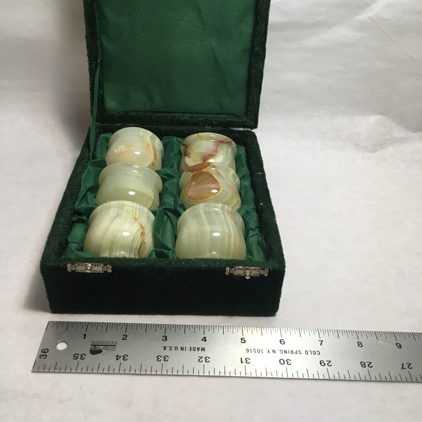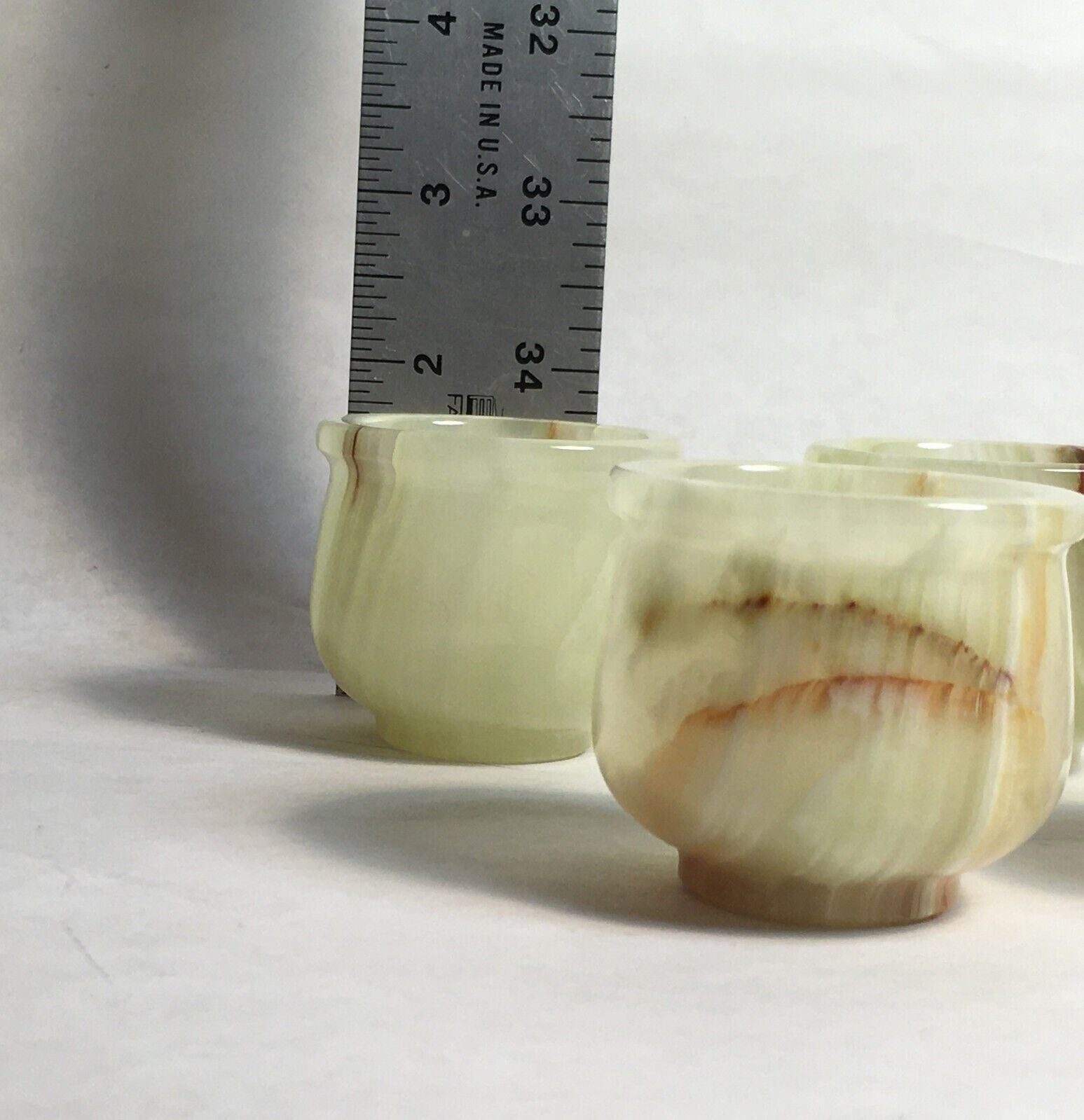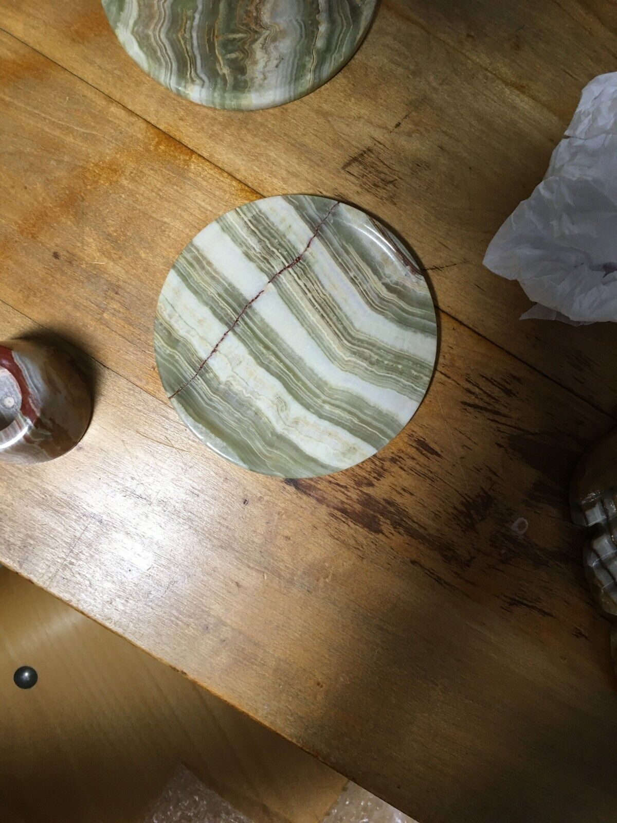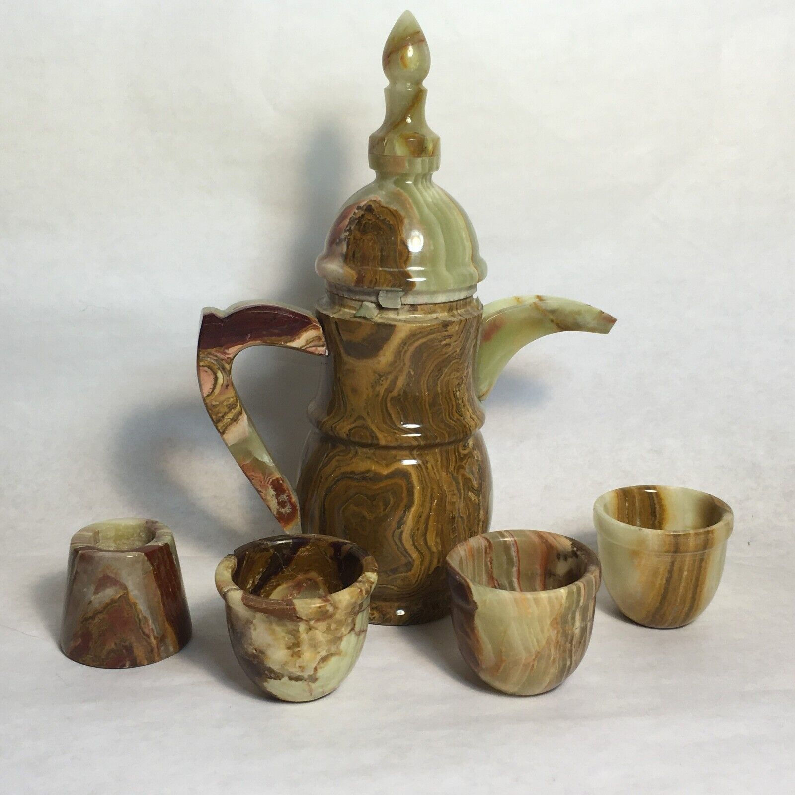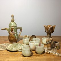 This is a big discount for the whole set, but these are available separately. Marbled green and brown onyx is from Pakistan. Six of the cups come in a velvet box. One candle is a flower and the other is small with a tag. There are three coasters and one seems to have a crack. Similar tea pots online seem to have a piece of metal that keeps the lid from sliding off the bottom. If you look carefully, that seems to be missing, so you would want to hold the lid if using for serving or keep it just for display. After I first posted this, I dropped it when photographing for this set. The top came off cleanly, so it probably was assembled in parts originally. I can glue it or leave it as you prefer please specify. Look at the photos carefully for some tiny chips on the unboxed cups.