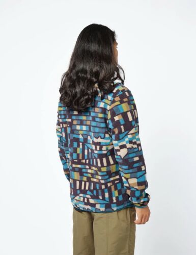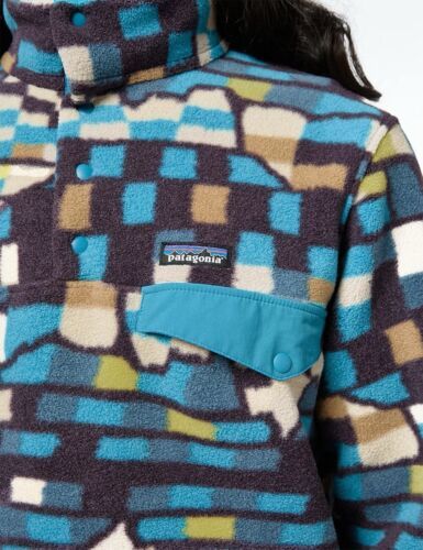 This Patagonia Synchilla Snap Fleece Pullover in size XXL for men features a multicolor geometric pattern with a stand-up collar and button accents. Made of fleece fabric with a durable water repellent finish, it offers a regular fit and anti-pilling properties. Ideal for travel, casual, or workwear occasions, this mid-length jacket is lightweight, warm, and designed for outdoor activities in winter and fall seasons.
