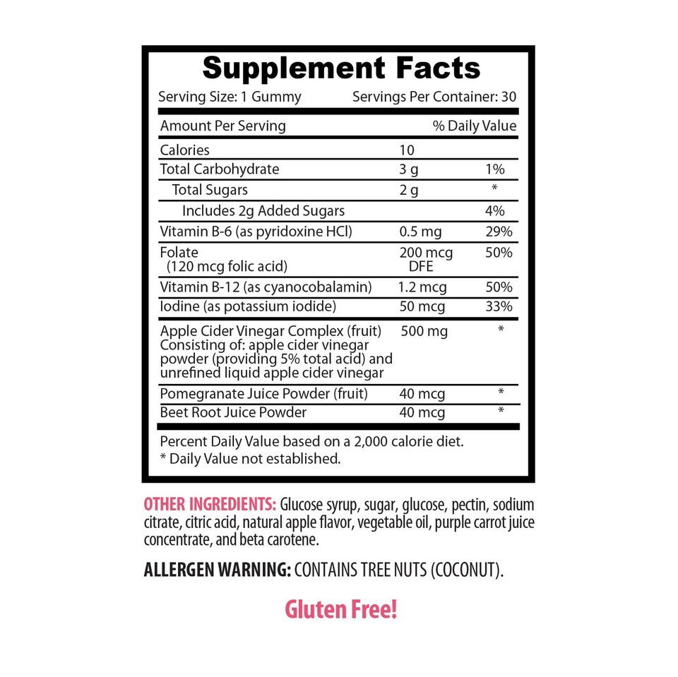 APPLE CIDER VINEGAR GUMMIES - HEALTHY METABOLISM: Apple cider vinegar is known to support a healthy metabolism, which can help your body efficiently convert food into energy. Apple cider vinegar has been used for centuries as a natural way for skin concerns. Our gummies may help support healthy skin by promoting a balanced pH level and reducing free radicals.