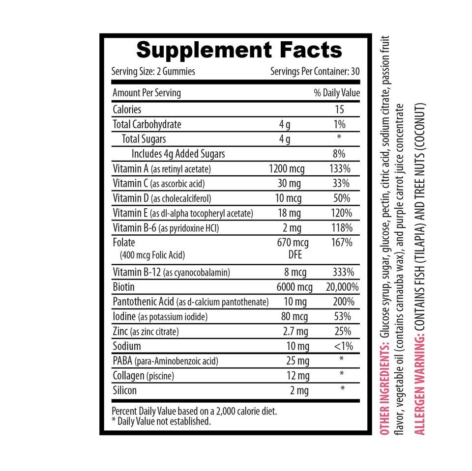 HAIR, SKIN NAILS: Introducing our delicious and nutritious Hair, Skin Nails Gummies Supplement, packed with Vitamins A, B, C, D, E, B-6, and B-12, as well as biotin, PABA, and collagen and essential vitamins and nutrients to support your beauty from within. With a refreshing passion fruit flavor, these gummies are perfect for those looking for a tasty way to improve their overall wellness. Our Hair, Skin Nails Gummies Supplement is packed with biotin, an essential vitamin that promotes healthy hair growth, making your hair stronger and more vibrant.