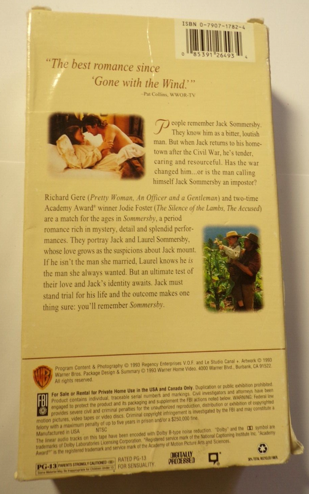 Sommersby VHS VCR Video Tape Movie Richard Gere Jodie Foster Used