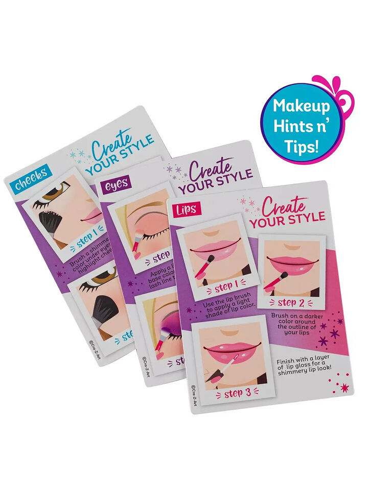 Cute make-up backpack with 2 mirrors plus, eyeshadows, lip colours and cheek colurs. Includes make-up brushes and makeup tip cards. There's over 20 different colours! Trays fold out for easy access! Then close it up and take with you, for beauty-on-the-go!
