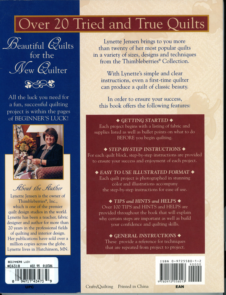 Thimbleberries Beginner's Luck, Over 20 Tried and True Quilts, by Lynette Jensen. 120 pages, softcover, 2003. Book is in excellent pre-owned condition.