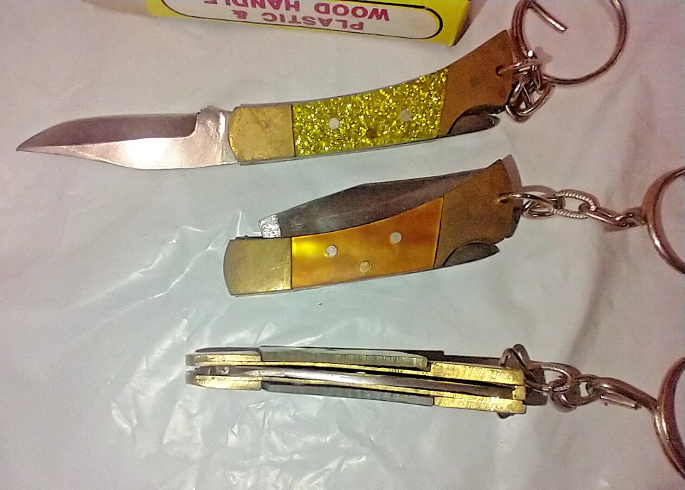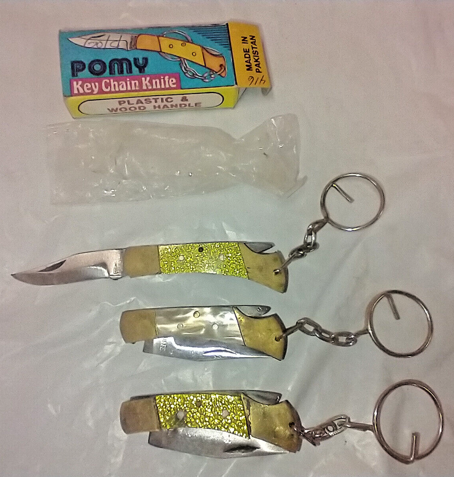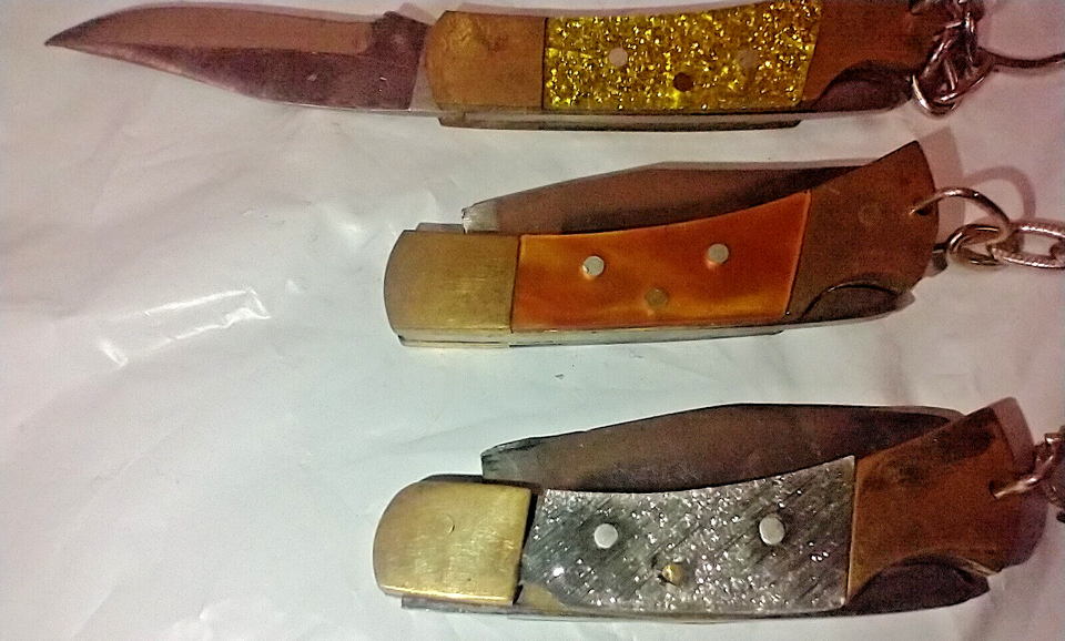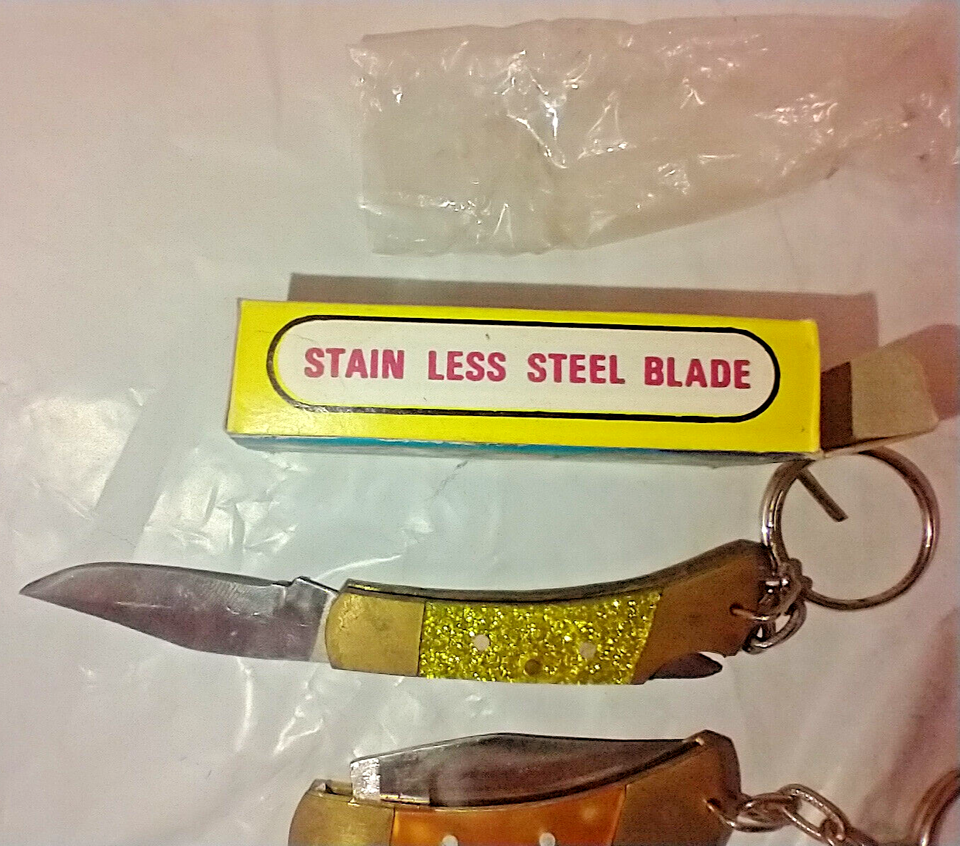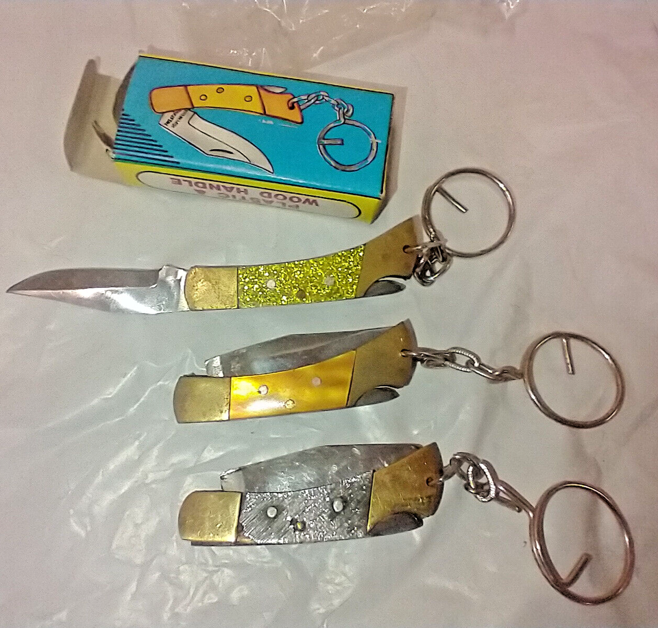 KNIFE ABOUT 4" LONG AND BLADE ABOUT 2.75". AS YOU CAN SEE IN THE PICS ONE HAS A PIECE MISSING ON THE HANDLE AND 2 OF THE 3 HAVE DIFFERENT COLORED SIDES. LET ME KNOW WHICH ONE YOU WANT. ALL SOLD AS-IS NO RETURN.