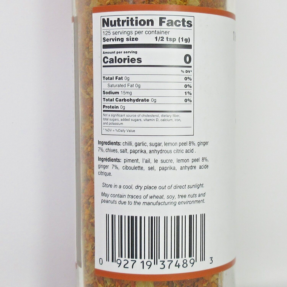 Ingredients: chili, garlic, sugar, lemon peel 8%, ginger 7%, chives, salt, paprika, citric acid.