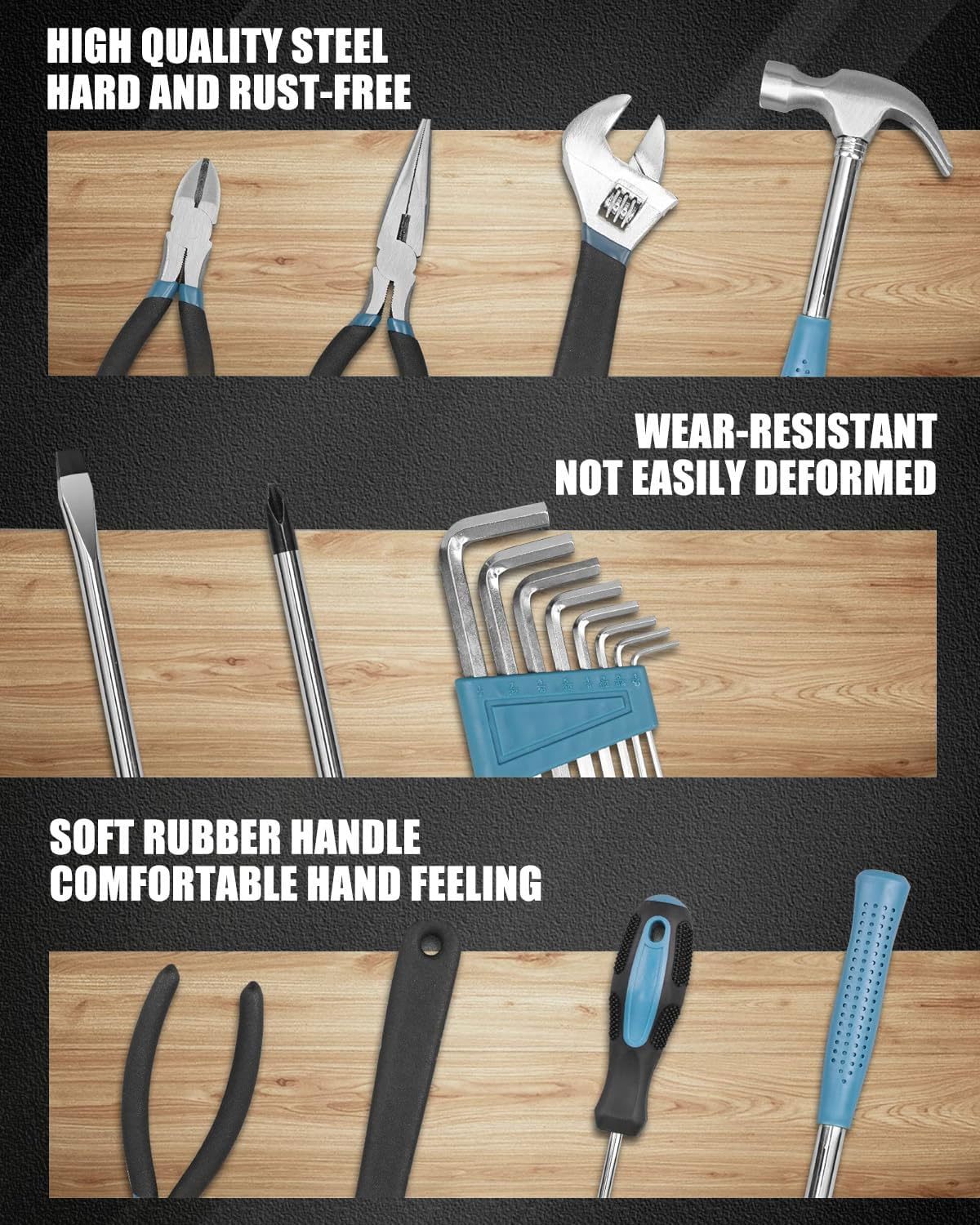 Multi-functional Hand Tool Set: Versatile and easy to handle, this basic home tool kit is a practical and professional helper, whether it's for repair or maintenance, drilling, furniture and toy assembly and design, this portable hand tool set will meet all your needs Durable Reliable: All tools are made of high quality jet and the surface is treated with anti-corrosion.The portable, blow moulded case keeps all tools neat, stable and safe, so you can easily find the tools you need and do DIY homework faster.Compact Portable: This household tool kit has a portable, blow moulded case keeps all tools neat, stable and safe, so you can easily find the tools you need and do DIY homework faster Please Note:Due to long distance transportation, some parts may be scattered, please organize and arrange them according to the specific product location shown in the product details. Please apply for an exchange if there are any missing parts. If you have any issues, please contact customer service 100 Pieces Hardware Kit Box: Included is a 100pieces accessories kit box: 10 x Grey plastic anchors, 10 x Self drilling screws, 5 x Colorful push pin, 5 x Brass cup hooks, 64 x Galvanized flat-head nails,6 x Brass flat-head nails You Will Get: 100 Pieces Hardware Kit Box, 20 Pieces Screwdriver Bit Set, 8 Pieces Hex Key Set, 5 Pieces Combination Wrench Set, 1 x Adjustable Wrench, 1 x Long Nose Pliers 6", 1 x Diagonal Pliers 6", 1 x Claw Hammer of 8oz, 1 x Spirit Level of 90 and 45,1 x Flat Pry Bar, 1 x Voltage Tester, 1 x Measure Tape of 3M/10ft, 1 x Ratchet Screwdriver, 1 x Slotted Screwdriver, 1 x Philips Screwdriver