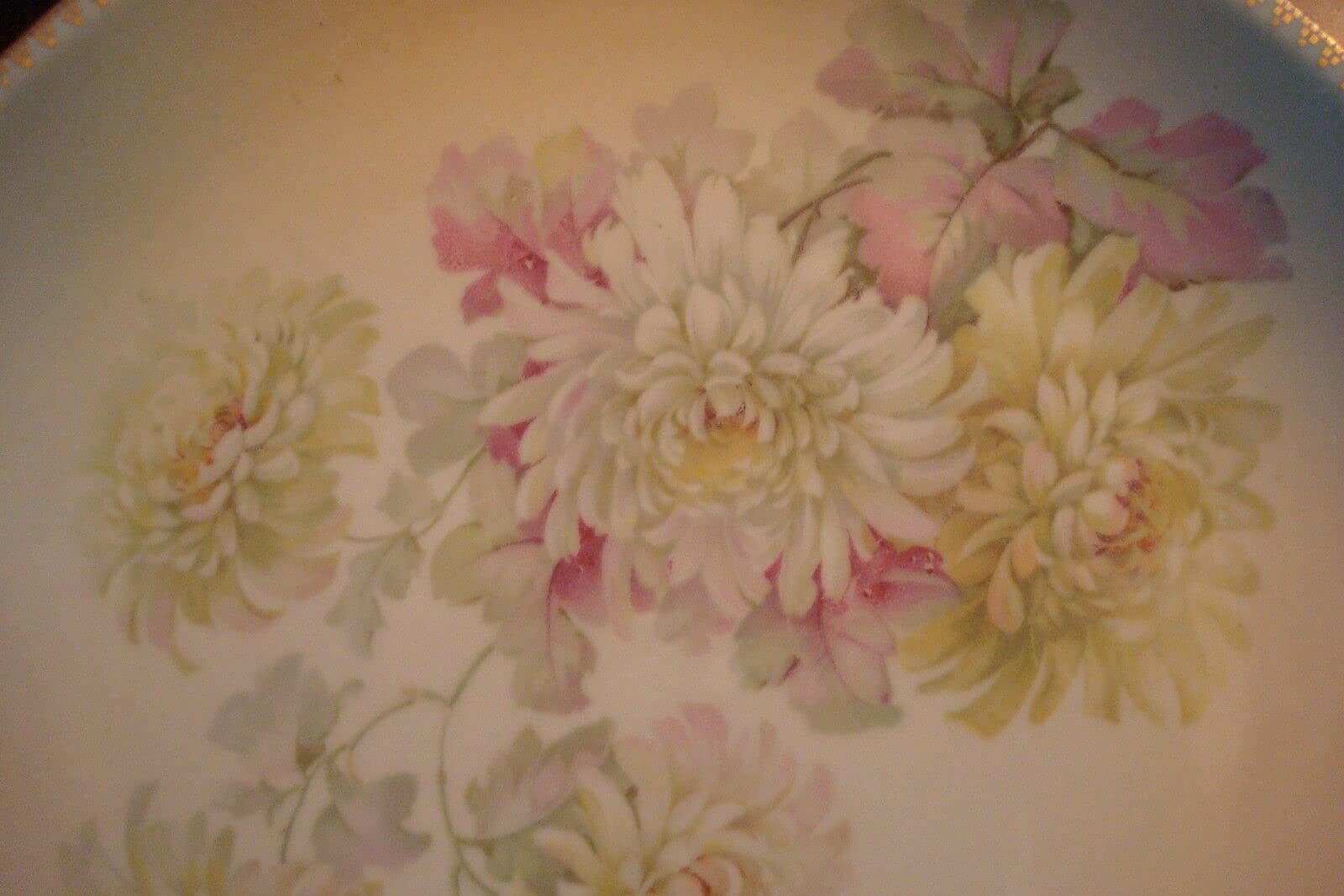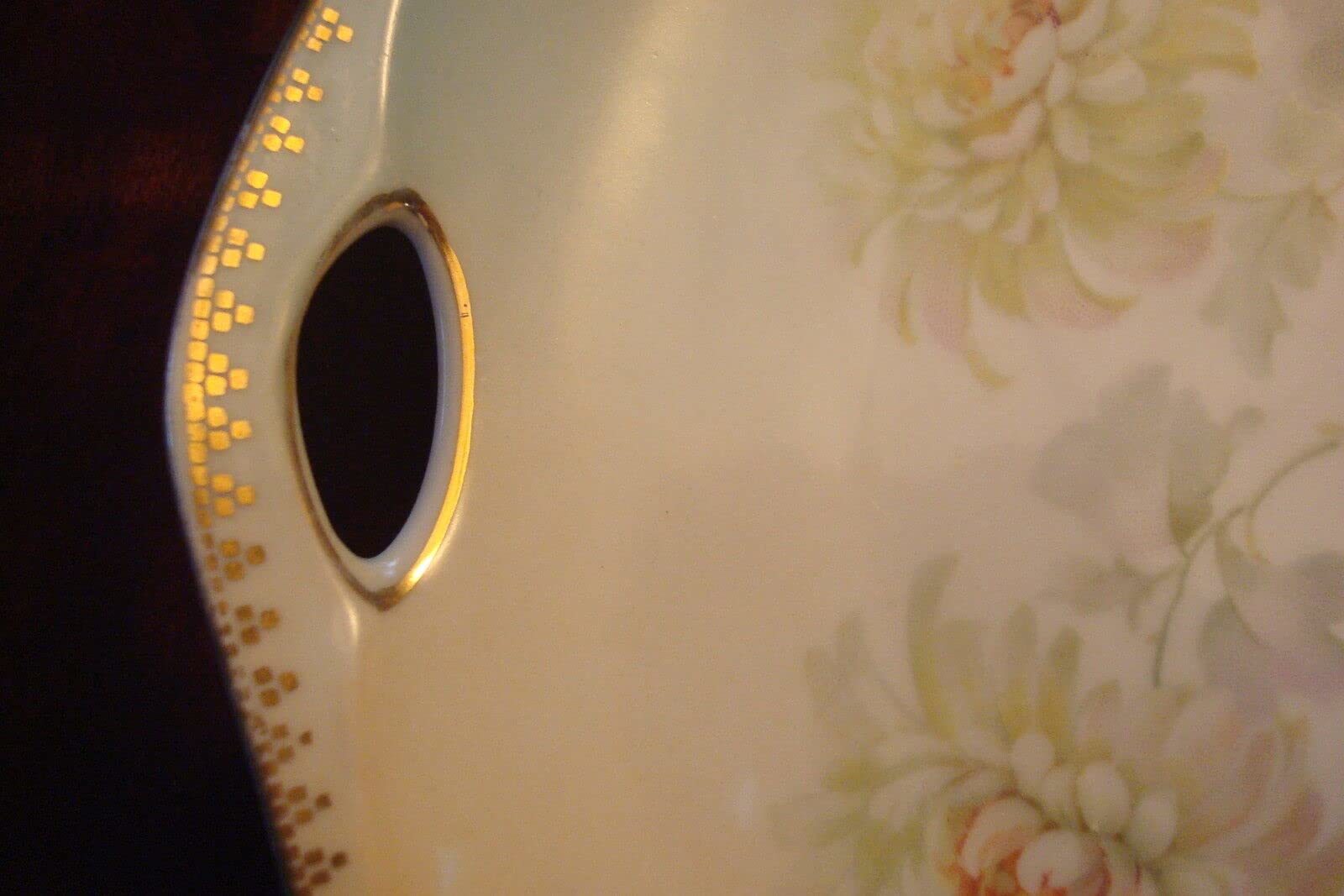 German Oval Platter 2 handles pastel colors, gold rim, marked made in Germany 10 1/2" long, 8" wide, very good condition, some light surface scratches commensurate with age