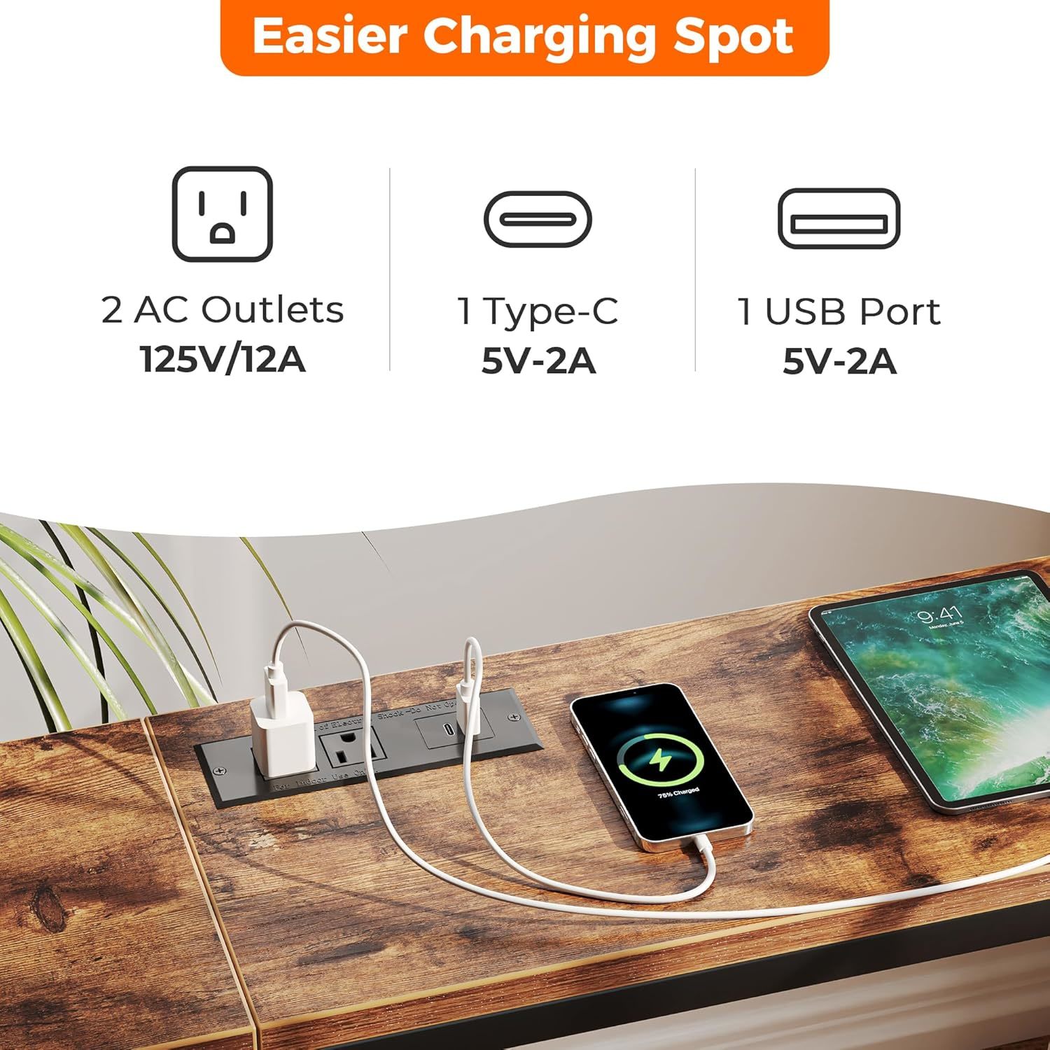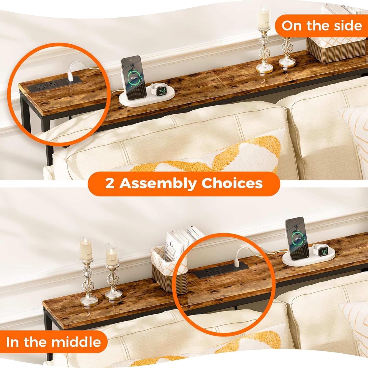 [No Low Battery Warnings]: Imagine lounging on your sofa and brushing your phones to relax after a busy week. Don?t let low battery disappoint you. Let this behind couch table with 2 AC outlets and 2 USB ports provide close-at-hand power [Space Artist]: Your sofa back is empty? Let this entry way home table give you space surprise. Set it up in the narrow and long hallway to welcome your odds and ends; or how about putting it under the window to be a plant table, giving your green plants more sunlight [Quality Never Let You Down]: Sturdy P2 particle board works well with a durable metal frame, giving the long skinny table surface a supporting bearing up to 100 lb. Exactly a long-time service investment [For More Stability]: Equipped with adjustable feet to ensure stability even on uneven floors, adjust it to protect your desktop items from falling down. And more significant, the anti-tip device gives a more safe sense [Simple Yet Stunning]: With numbered parts, clear instructions, and needed tools in the package, this console table will be assembled quickly, saving your time from tedious labour