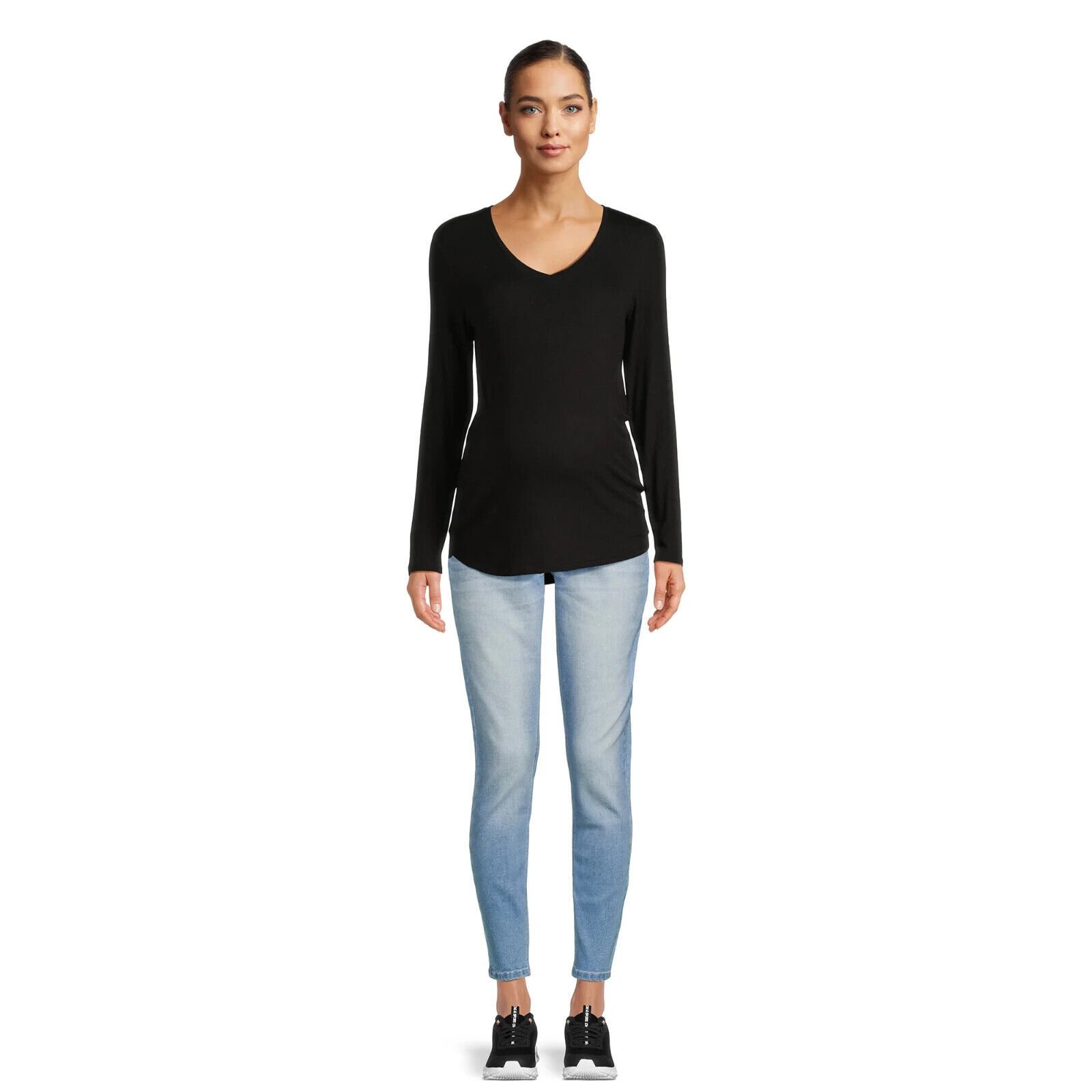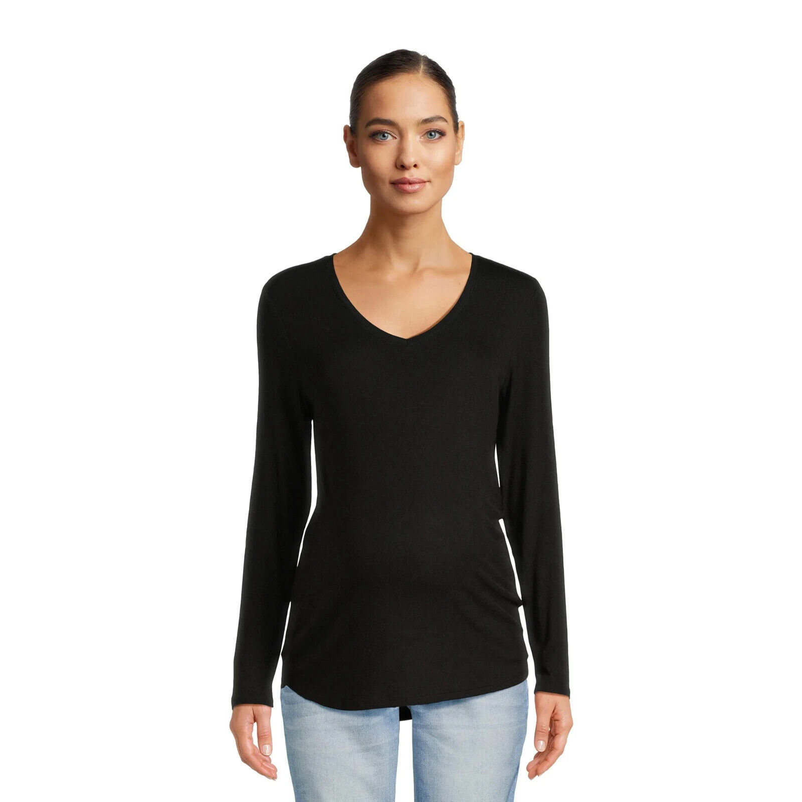 From Time and Tru, this long sleeve T-shirt with curved high low hem is a must-have basic for your pregnancy wardrobe. This soft span blended rib fabric acommodates your changing figure and it's comfortable with enough length to cover your baby bump. This Time and Tru V-Neck T-shirts are perfect for your versatile, modern and casual outfit as these pair with jeans or leggings.
