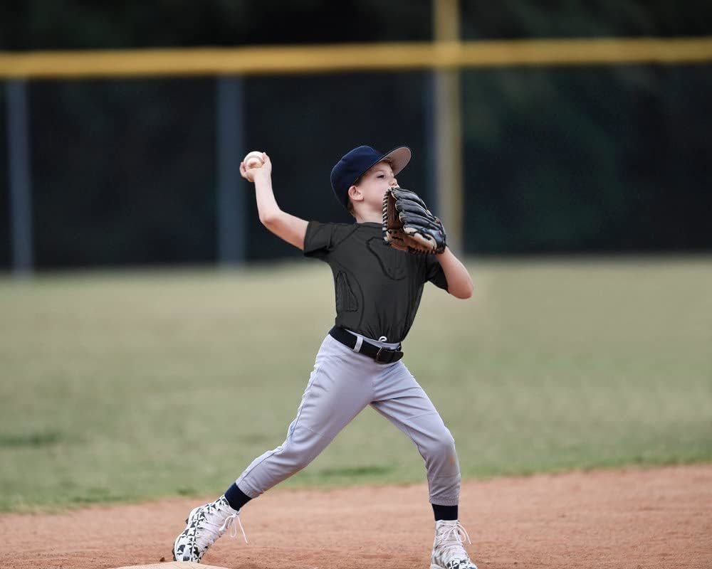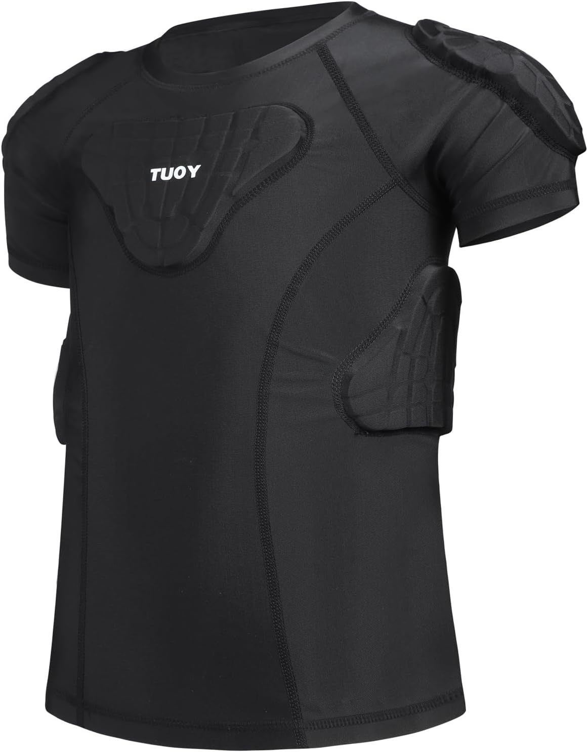 90% Polyester + 10% Spandex Fit Chest Size: YS=25-26.5''; YM=26.5-28.5''; YL=28.5-30.5''; YXL=30.5-32''. If your kids don't like the tighten feeling, please choose a larger size. Keep the skin cool and dry, offering maximum comfort Freely stretchable, sweat-wicking fabric with smooth touch Designed to protect kids body from injury. Effectively protect your shoulders, chest, ribs back in sports activities. Wear either outside or inside, as base layer under sports uniform, perfect for football, basketball, baseball, rugby, soccer, paintball, skating, snowboarding, skiing, cycling and all other contact sports