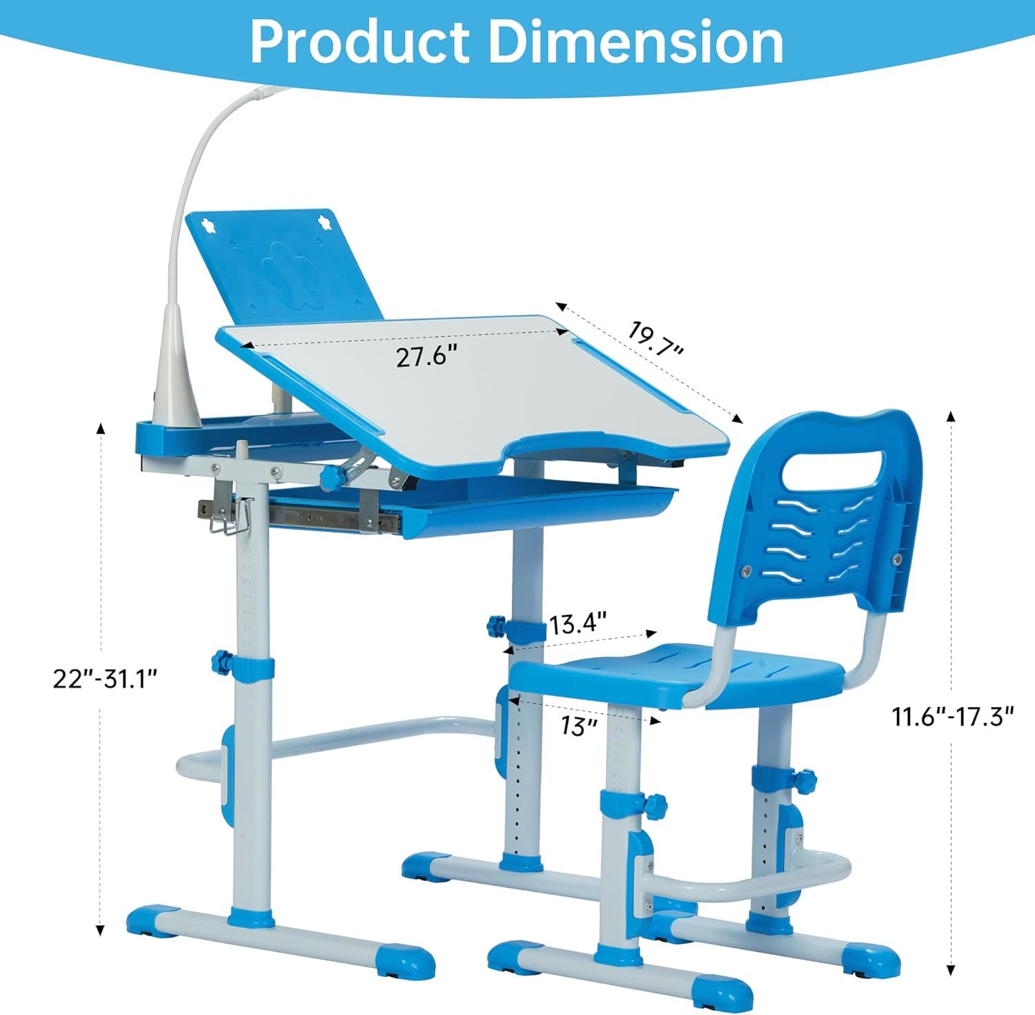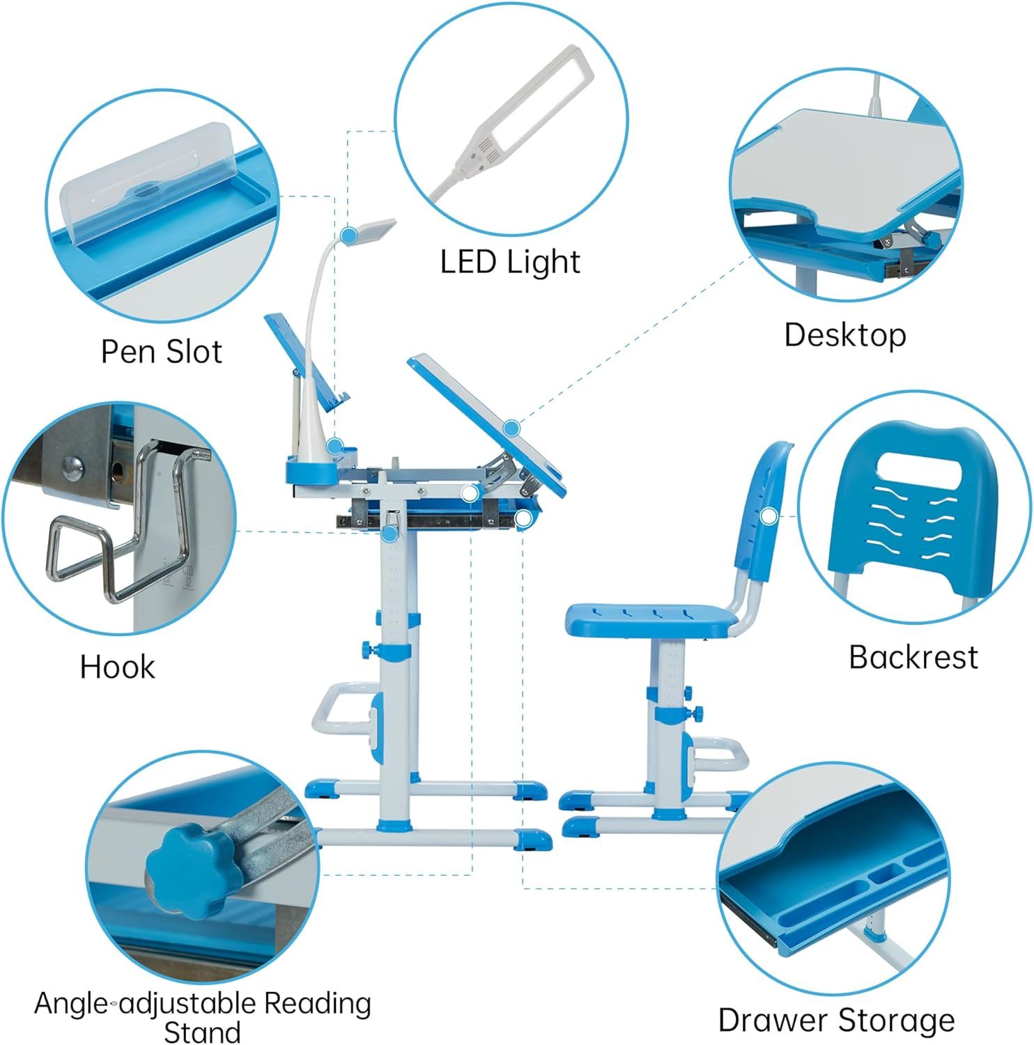 ? Tiltable Desktop ?The 27.5 "x19.6" desktop can be tilted from 0 to 40 , meeting different needs for desktop angles during learning and use. Prevent hunchback. ?Pen Box Storage?The pen slot is used to store various learning pens, which is convenient to store and can be easily removed, making it not easy to lose. ?Adjustable bookshelf?The adjustable bookshelf is used to place books, iPads, and adjust the appropriate distance to protect children's vision. ?LED lights?LED lights have three brightness levels, and the direction and brightness of the lights can be freely adjusted according to the needs of children. ?Easy to clean?Easy to clean, just wipe off stains, dirt, or other media.