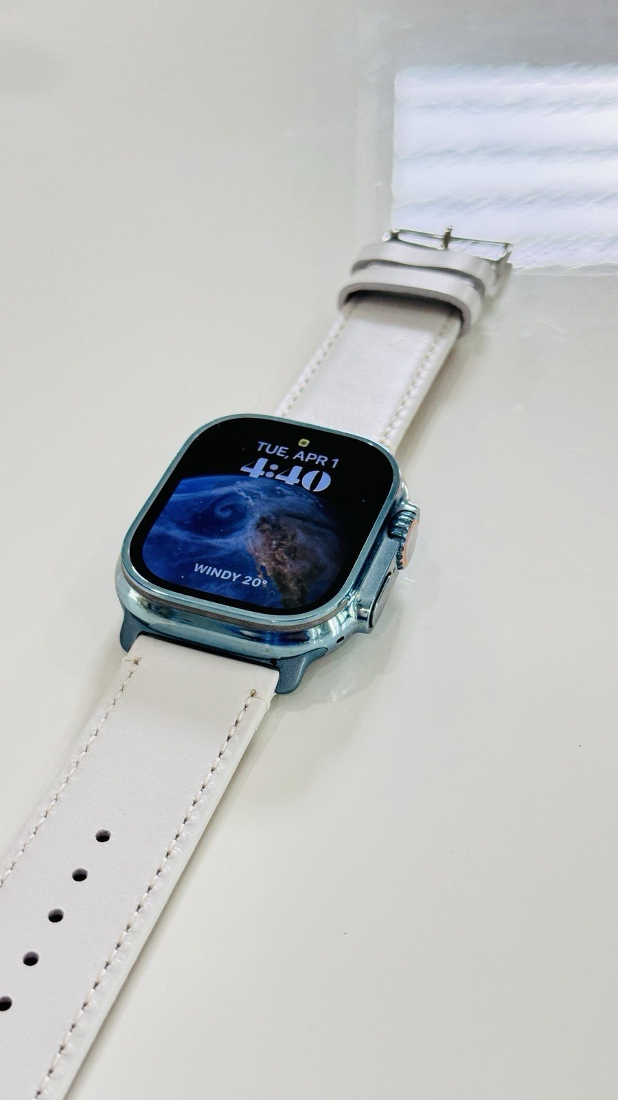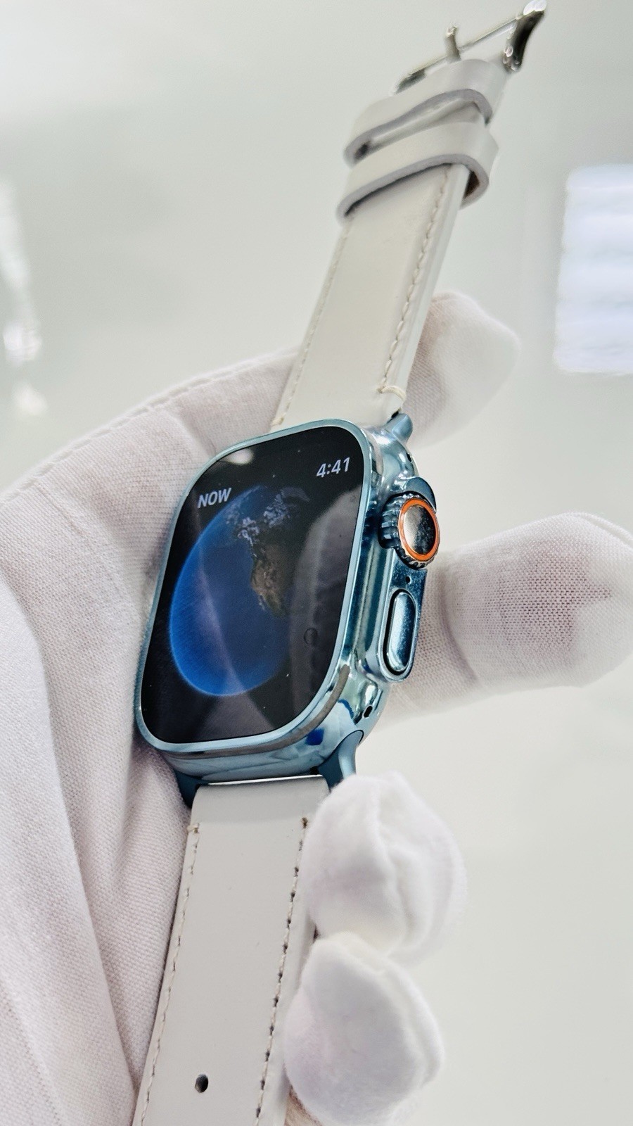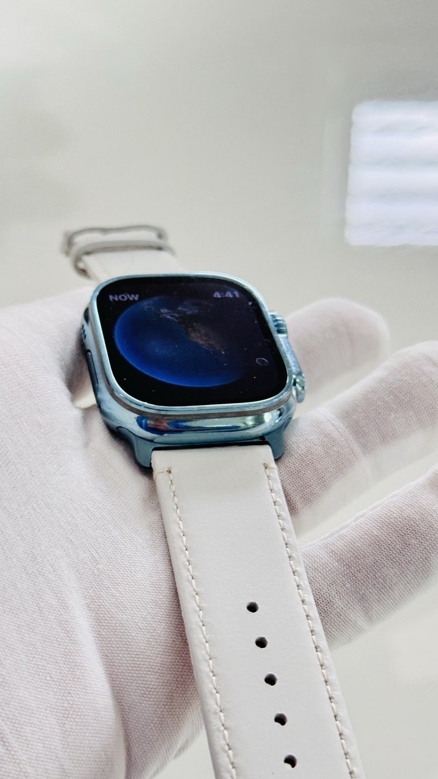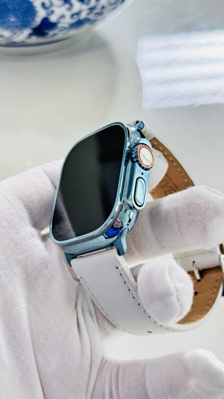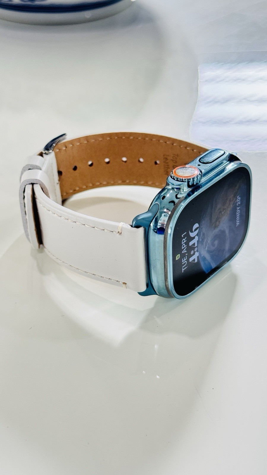 Custom Apple Watch ULTRA 2 49mm SKY BLUE Polished Anodized White Leather LTE GPS