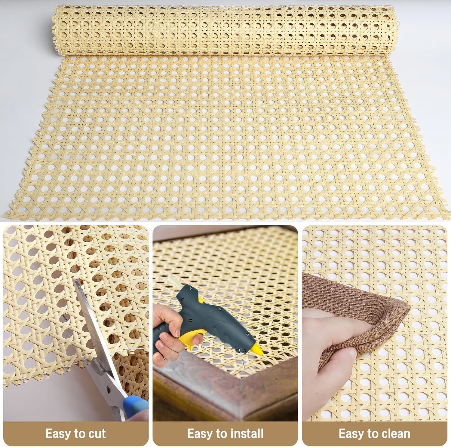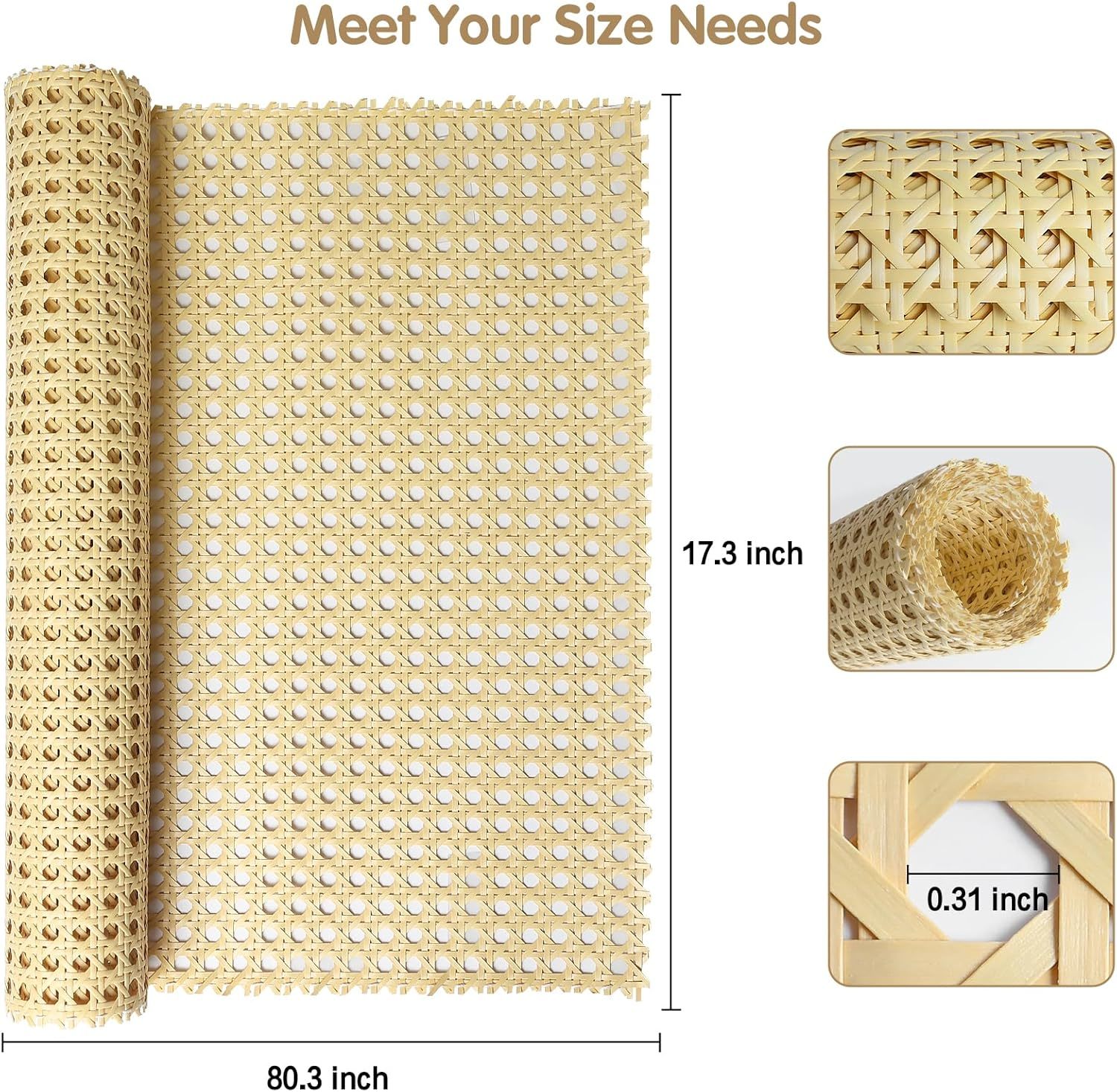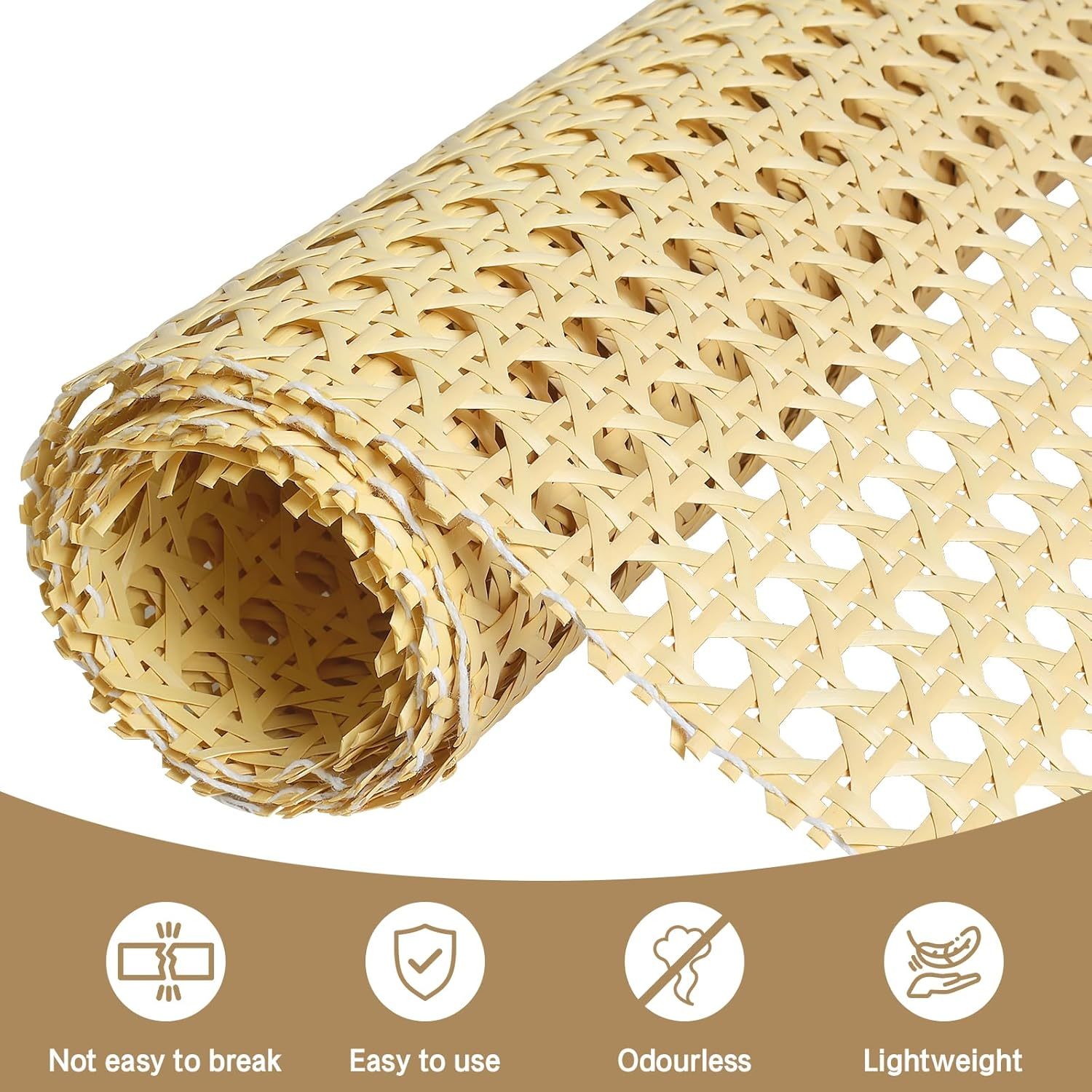 Cane Rattan Webbing: The rattan roll is lightweight and flexible, easy to carry and store, you can unleash your DIY creativity and make your living space more comfortable by using our caning material Rattan Material: This cane webbing roll is made of PE material, lightweight and made to last, not easy to break or deform, rest assured that our rattan webbing rolls meet quality standards for rattan materials Easy to Use: The rattan cane webbing rolls are easy to cut and fit, flexible and stretchable, easy to bend and shape. You can use scissors to cut the rattan to the size you want to add interest to your life and living space Applicable Occasions: Our rattan cane webbing can be widely used to make a variety of handicrafts and decorative furniture, such as furniture, chairs, tables, cabinets, ceilings, beds, etc., easily create your own rattan style Size Details: Package includes 1 roll of rattan, our rattan weaving roll measures 17 inches wide x 80 inches long, enough for your crafting needs, can be cut to the length you want