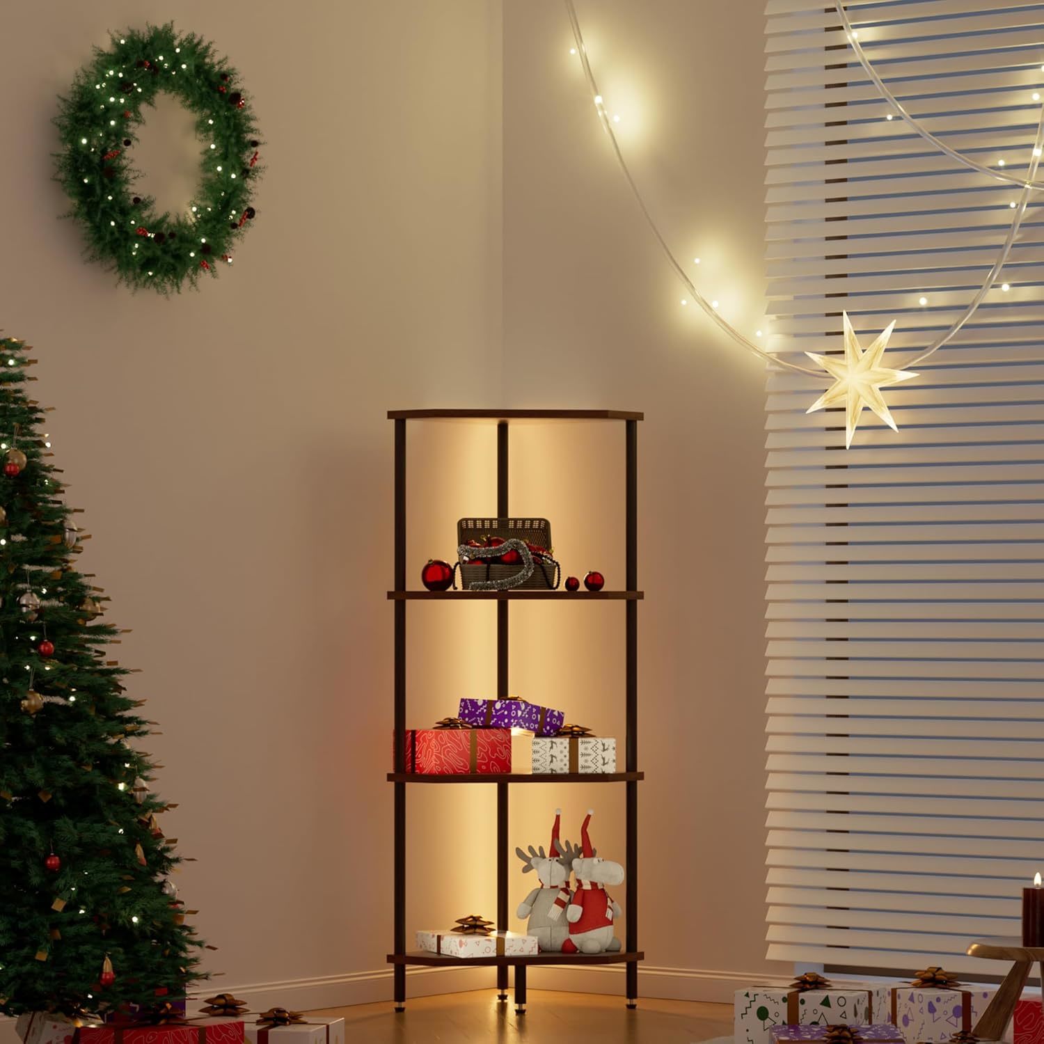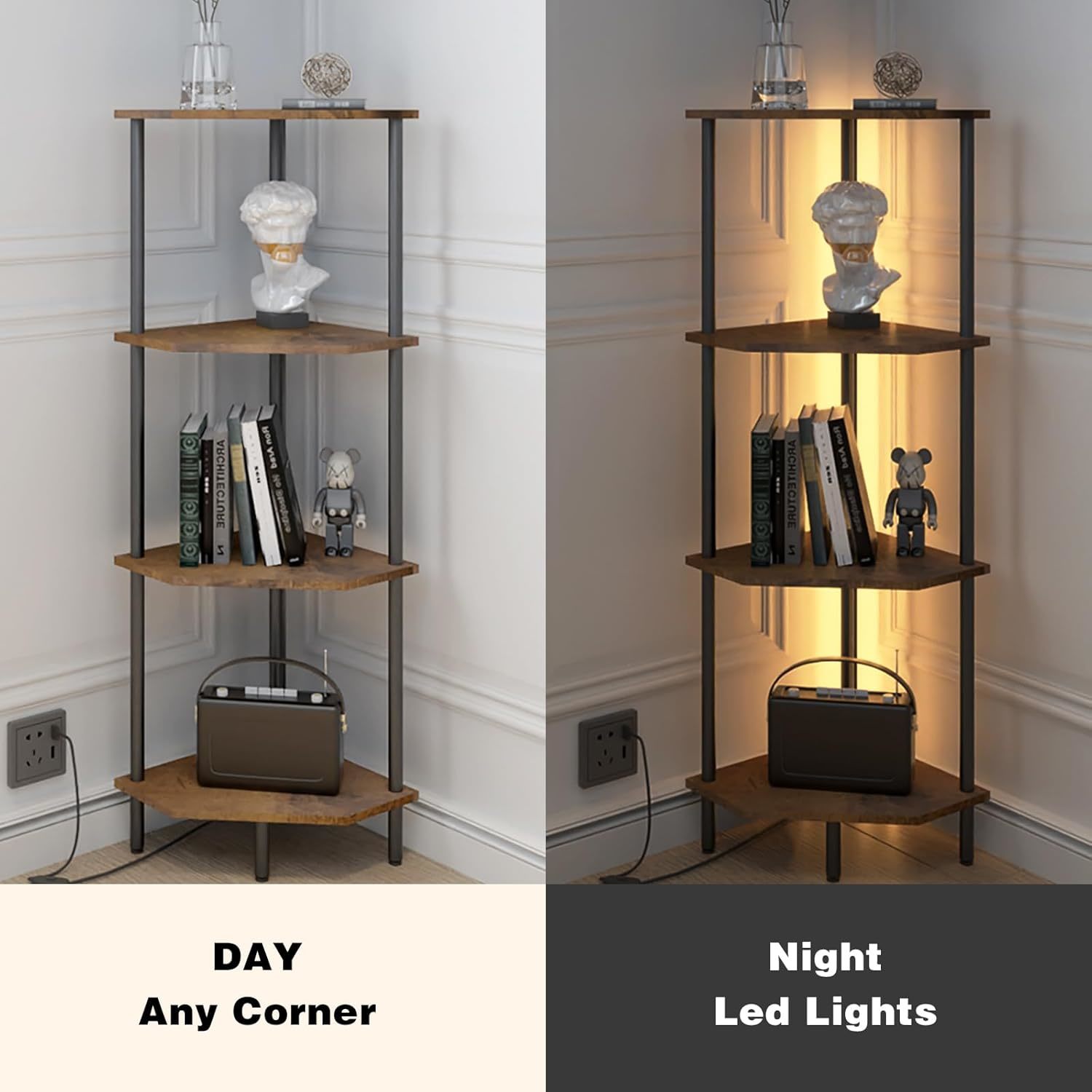 ?LED Light strip?: This corner shelf is equipped with LED light strip, You can be controlled button freely switch the color,brightness, flashing mode, and frequency of the lights, and can flash according to the rhythm of music. Corner bookshelf will create a cozy atmosphere in every corner of your home at night, enhance your gaming experience in the game room, or add atmosphere while watching a movie in the living room. ?Enhanced Functionality?: This corner shelves unit goes beyond just storage-it also offers unique display effects for room decor. With its sturdy wooden shelf board and thickened metal frame, it provides a stable platform for showcasing decorations, photos, plants, toys, scented candles, and even small audio devices. Enhance the aesthetics and personalization of your room with our versatile corner bookshelf. ?Easy Assembly?: Setting up our corner bookcase is a breeze thanks to its simple and straightforward assembly process.No need for special tools or skills - everything you need, including tools, accessories, and installation instructions, is included in the package. Additionally, we display shelf prioritize safety with an anti-toppling device to ensure stability. ?Versatile standing shelf?: Our narrow bookshelf are specially designed to be seamlessly installed in the corner of any room.Standing shelf not only save space and allow you to make the most of empty space, but also provide hidden wire channels to add a stylish touch to your decor.Whether in the living room, bedroom, kitchen, bathroom, balcony or office, this narrow bookshelf is the perfect place to store and display all kinds of items. ?Durable and Long-lasting?: Crafted from high-quality materials, our storage shelving are built to last. The thickened metal frame and sturdy wooden shelf board provide excellent durability and reliability. Our tall corner shelf the test of time, providing a long-term storage and display solution for your home or office.