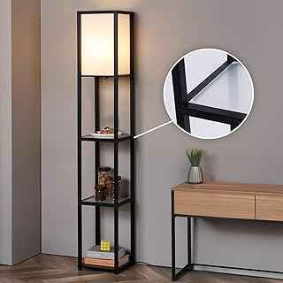 NEW. Floor Lamp with shelfs .Sleek modern design measures ;11D x 11W x ,65.75,H . Saves space The shelfs serve a multi functional use , Available in black frame. White shade .