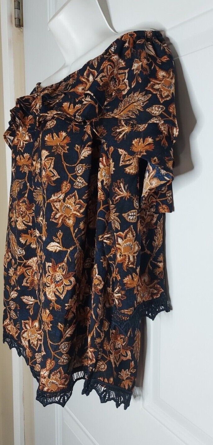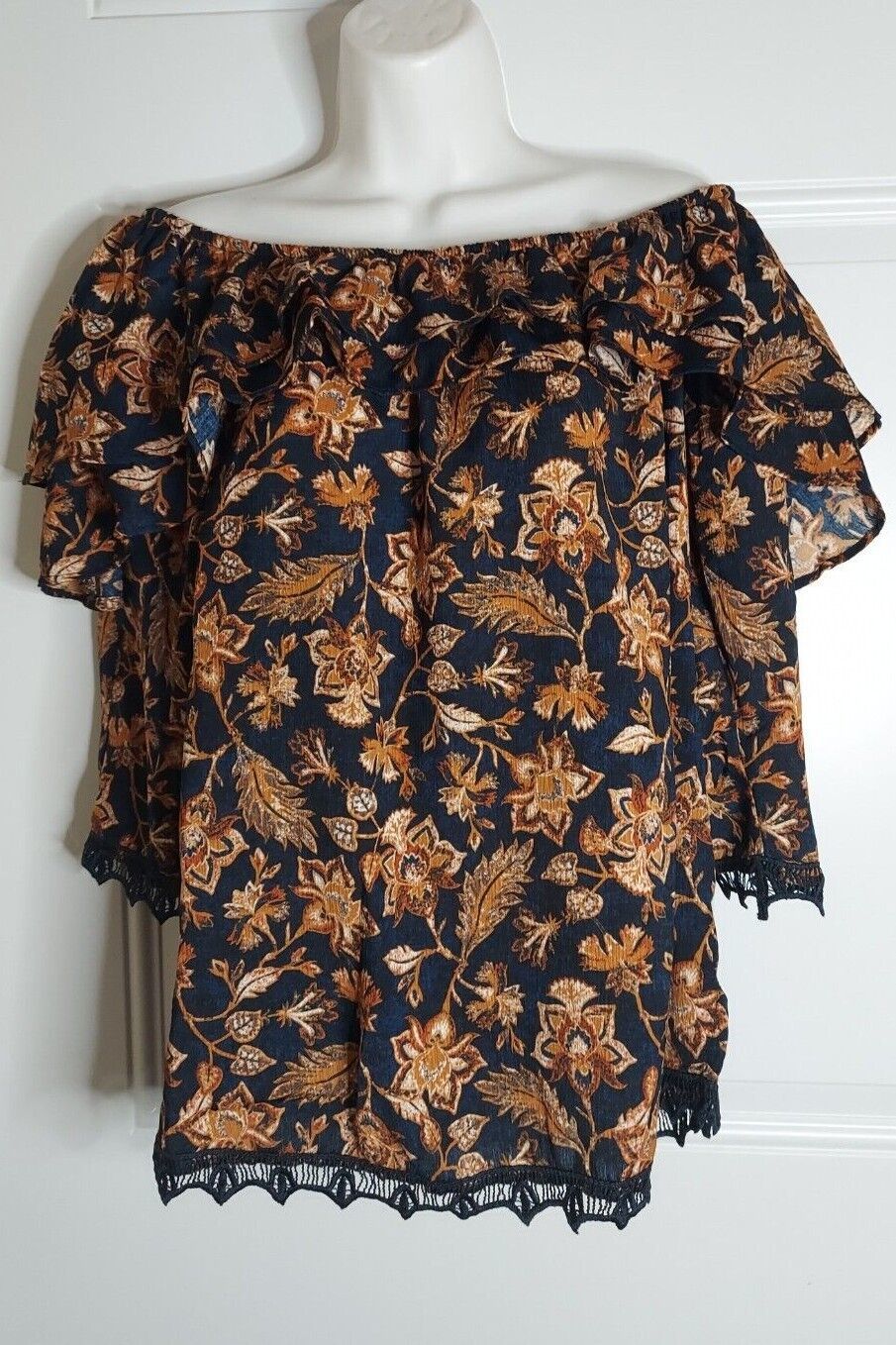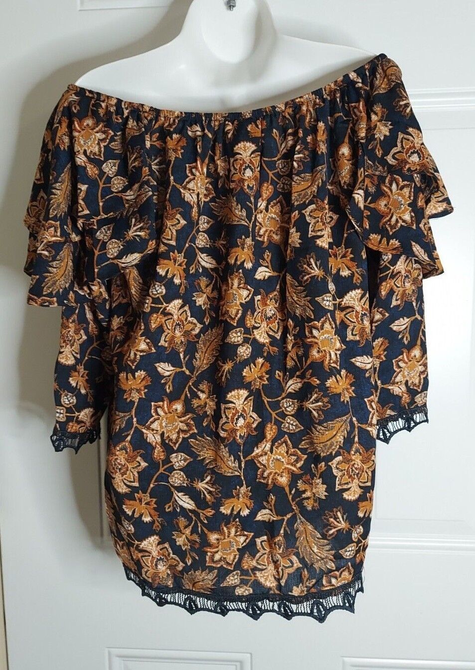 Knox Rose On Off Shoulder Boho Double Ruffle Neckline Embroidered Trim Top SZ S