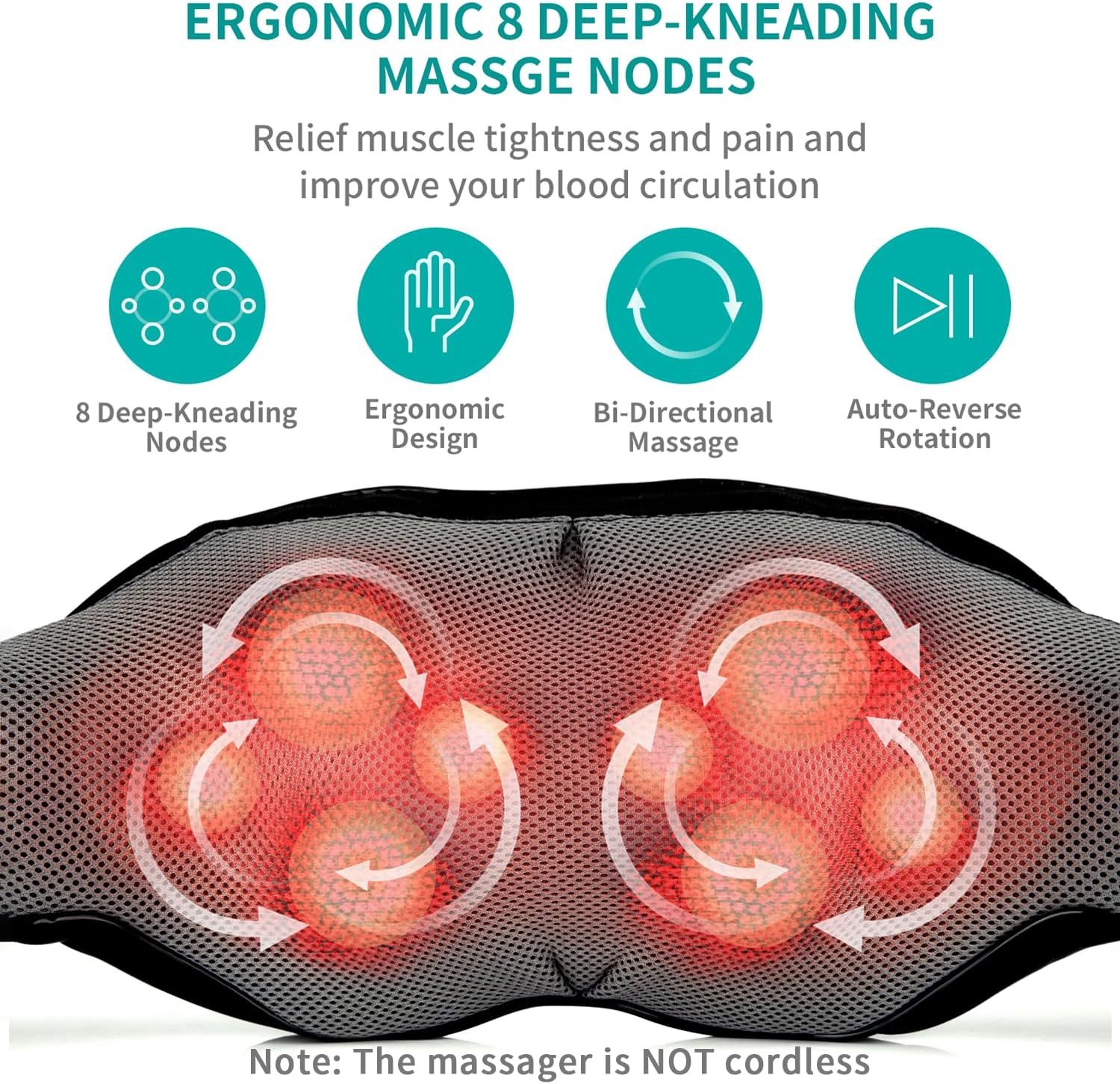 8 Powerful Deep-Shiatsu Kneading Massage Nodes. Our neck massager help you better with alleviate muscle soreness, ease neck stiffness, eliminate cervical fatigue, and relax yourself after a long day work Easy and Safe to Use. Built-in infrared advanced soothing heat function, the massager will improve your blood circulation, and it is settled within 15 minutes overheating auto-shut off protection. (Can be turned off manually) Adjustable Intensity. This shoulder massager has 3 speed strength level, so you can personalize the pressure to relieve muscle pain and the long handle straps can be used to adjust the massage position and strength as well Durable and Comfortable Matreial. Made of high-quality PU leather and breathable mesh fabric, Nekteck back massager is easy to use and clean. (The zipper is reversed design) Great Gift Idea Choice for Who You Loved. Perfect for home, office, car and travel use, it has a AC adapter and a Car adapter (all are UL listed)
