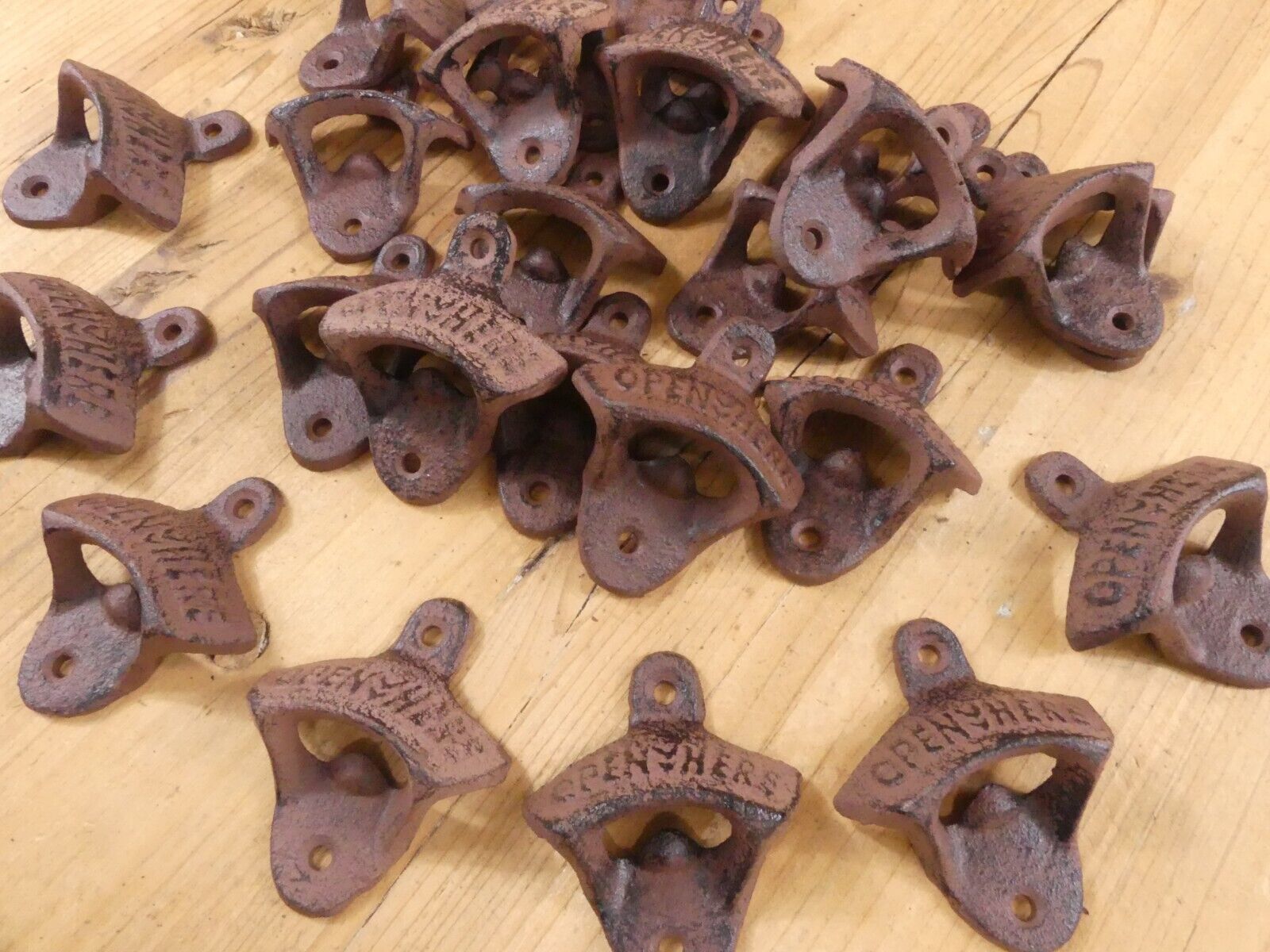 30 (TWENTY FIVE SHOWN IN PICTURE, SALE WILL INCLUDE 30) CAST IRON "OPEN HERE" BOTTLE OPENERS!