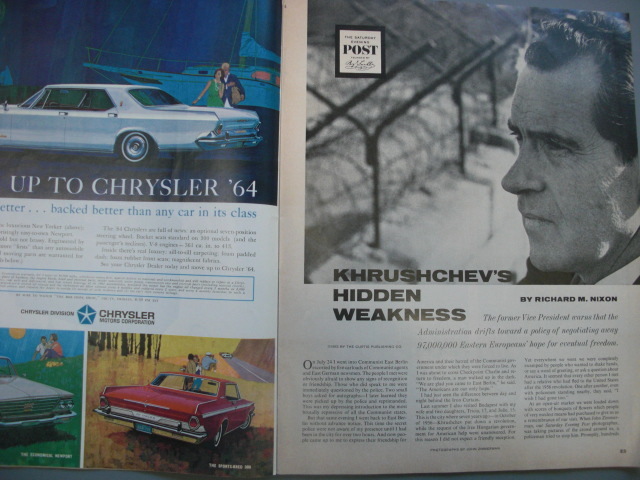 This October 12, 1963 Vintage Saturday Evening Post Magazine contains the following articles: Exclusive: From Behind the Iron Curtain; Richard M. Nixon Reports on Khrushchev's Hidden Weakness, A Wolf in The Family, The Priest Who Haunts the Catholic World, Yale Finds a Coach The Search for Jerry Lewis. This Saturday Evening Post Magazine's Cover is of Richard Nixon His Family at The Berlin Wall. The Color Advertisements include: Clairol, 7UP, Mercury, Pontiac, Thunderbird, American Oil Co., Chrysler, Campbell's Soup, Oldsmobile, Cadillac Budweiser. The Black White Advertisements include: Admiral, Longines, Culligan Many More. This magazine is in very good condition. This Post Magazine's measurements are 13 3/4" x 10 3/4".