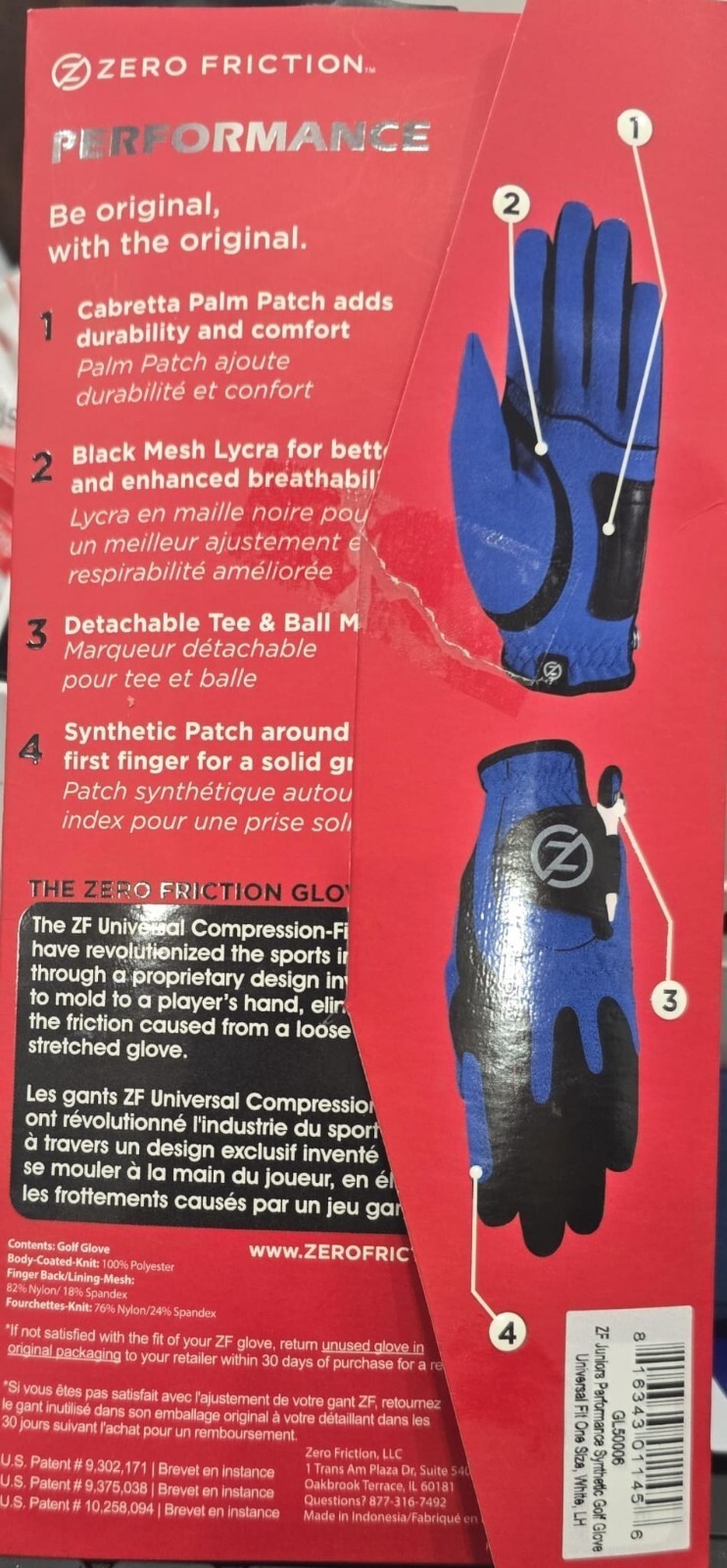 Zero Friction Junior Performance Synthetic Golf Glove, Universal-Fit, White, Left Hand