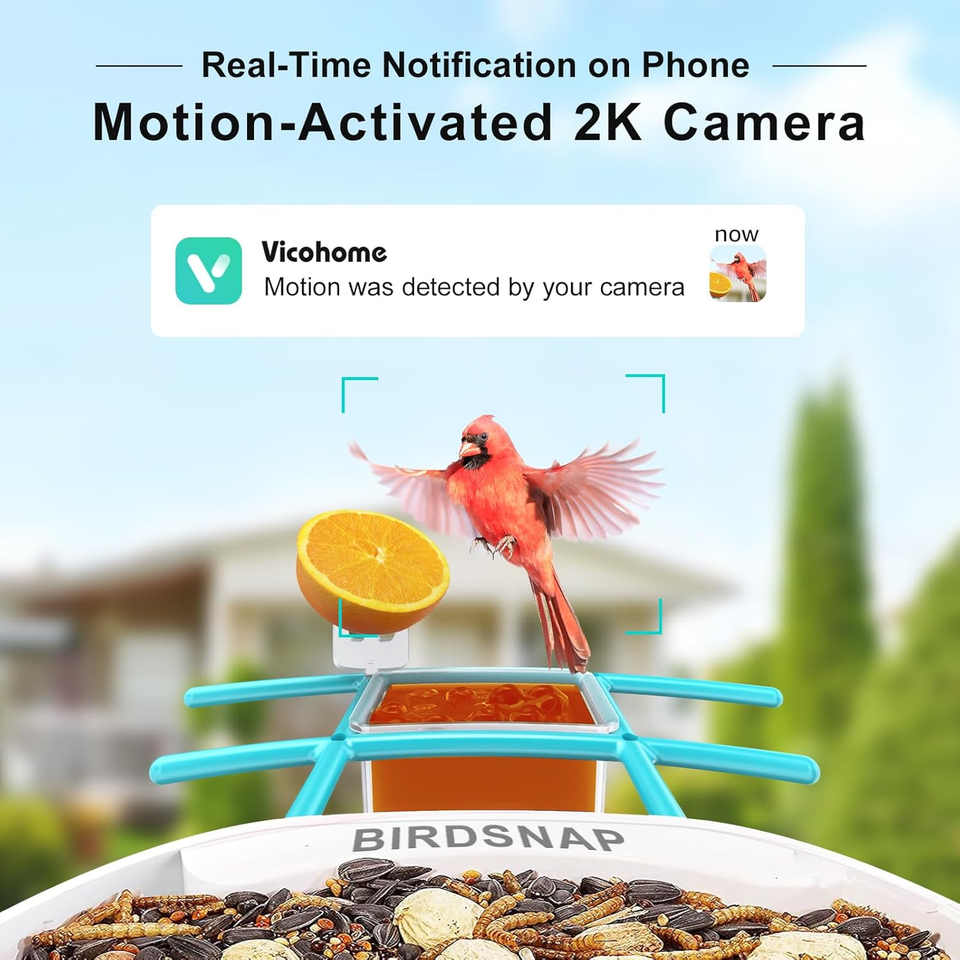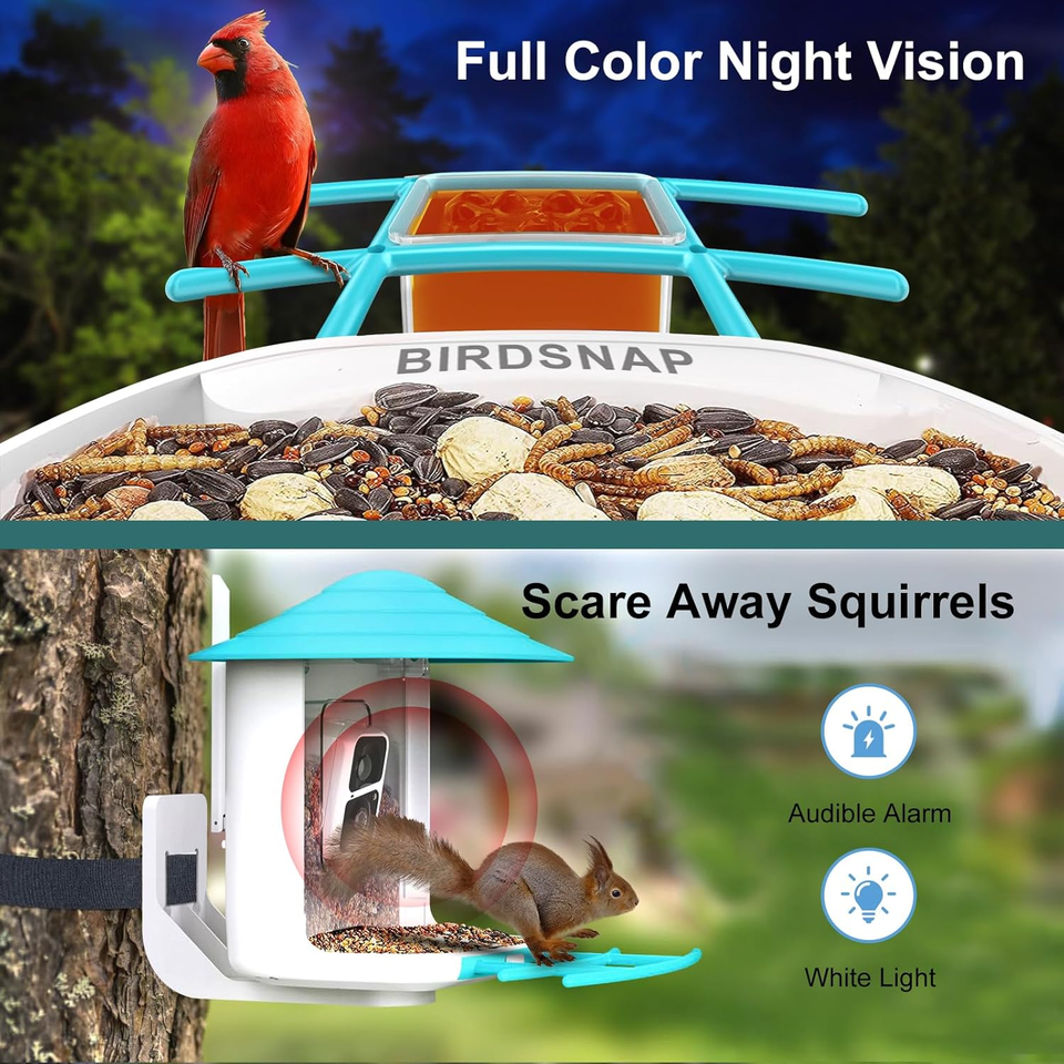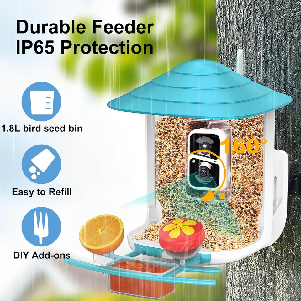??Enjoy Up-close 2K Bird Watching?Resolution of this bird feeder camera upgraded to 2K from December 2024. 160ultra wide view with color night vision, ensuring clear and vivid live stream, images and videos even at night. Detects each bird come and notifies in App. AI Recognition identifies over 10000 species (30-day free trial, subscription required) and provides a wealth of bird knowledge to help attract more birds to visit your backyard