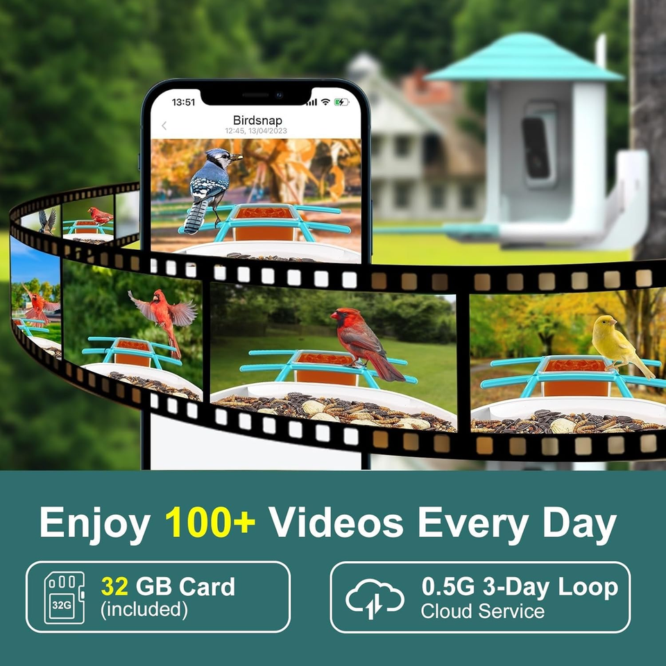 ??Free Storage, Share with Family?Bird camera can record videos and save them to cloud (0.5G/lifetime free) or included 32GB memory card (store 20000+ 10s videos, even can work without network). Each camera can connect to 4 phones simultaneously, you can invite family friends in other states or countries to join bird watching