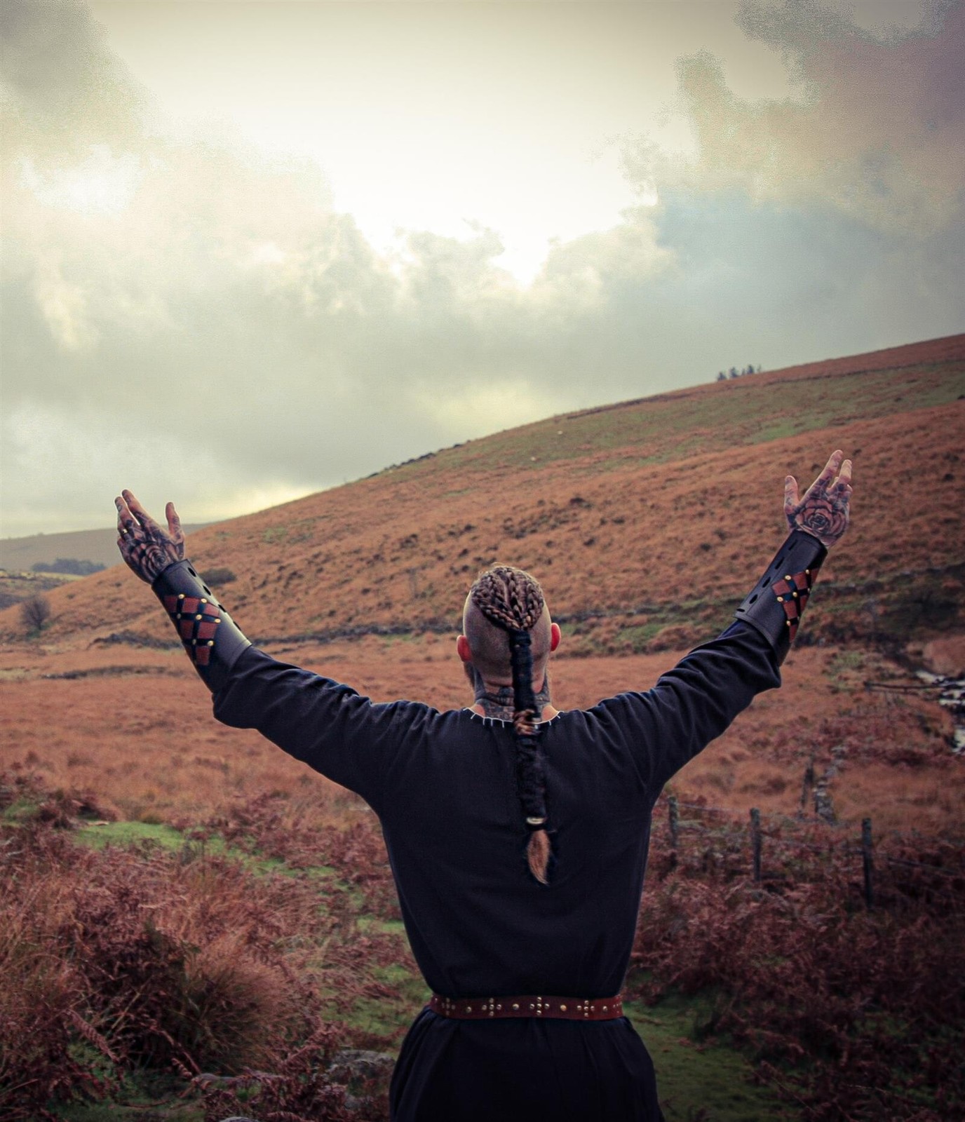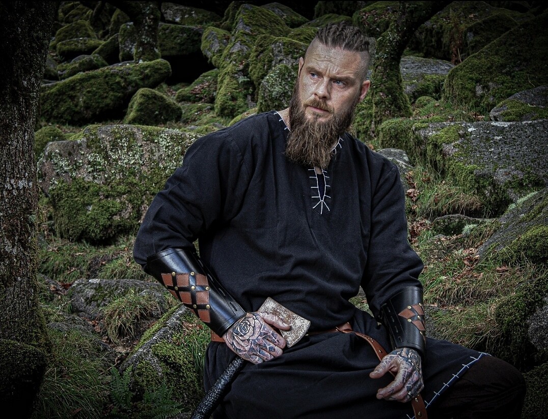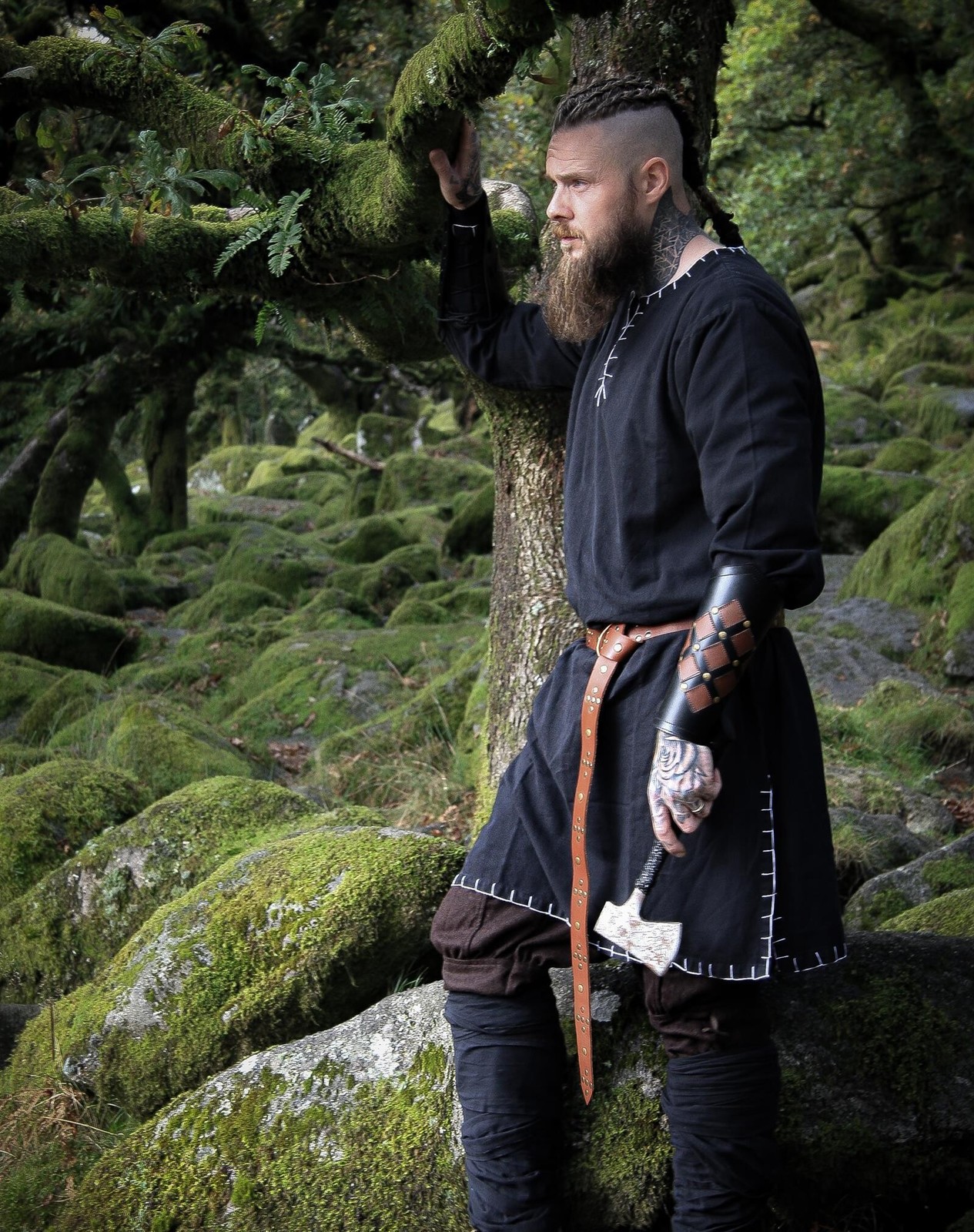 The split neckline and long sleeves offer a classic silhouette that echoes the early medieval period, while the detailed stitching adds a refined touch to this otherwise rugged garment.