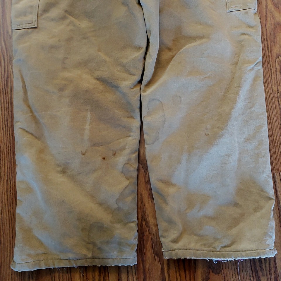 Fade, wear and stains throughout. Zippers are all functional, wear on hemline has a bit of fray. One tiny hole to the left ankle. No fabric thinning.