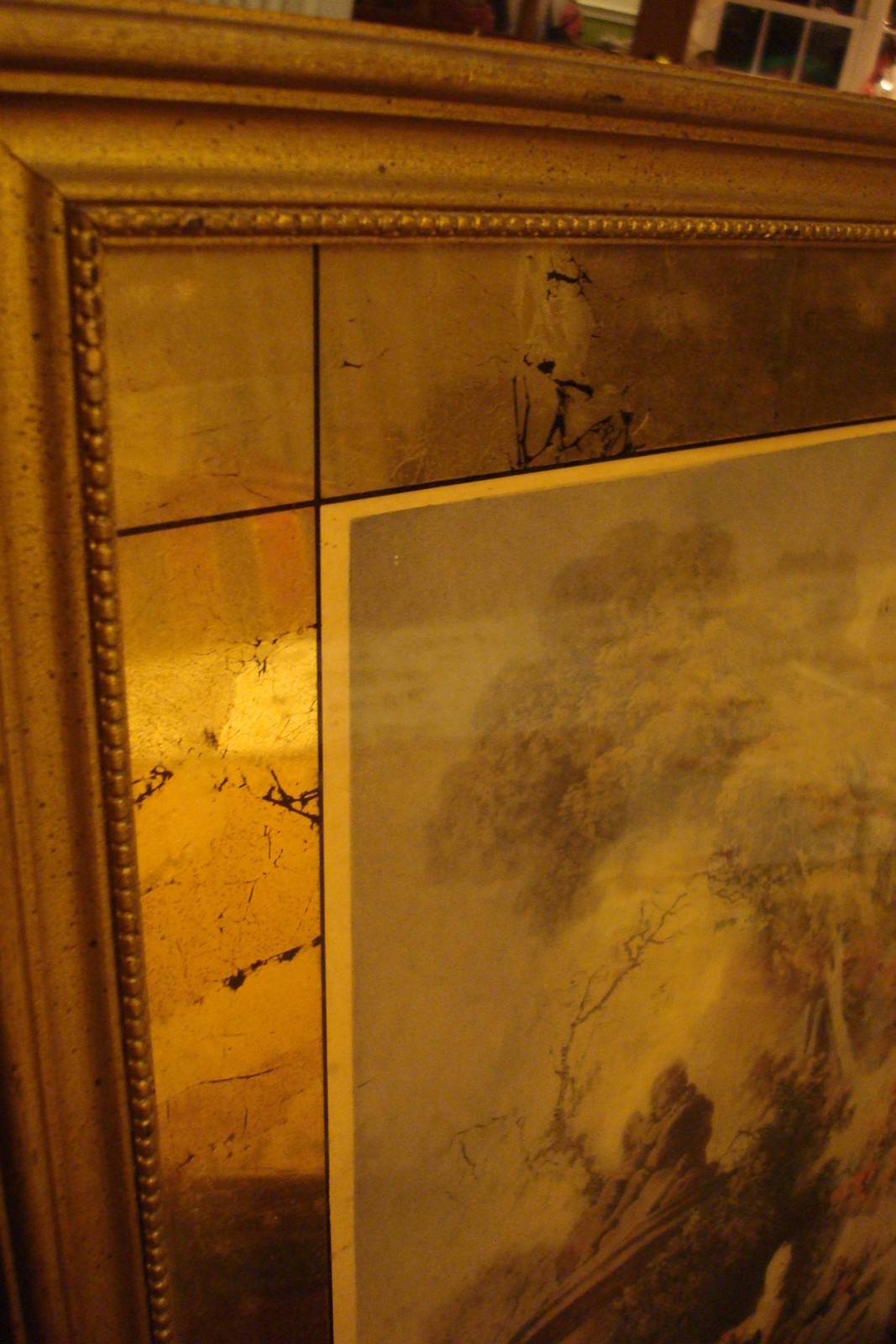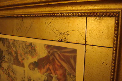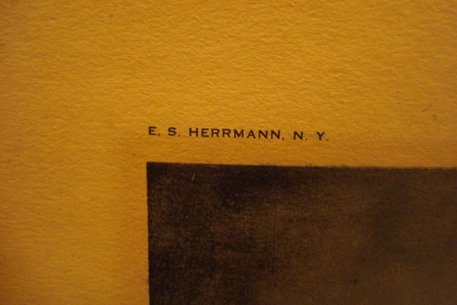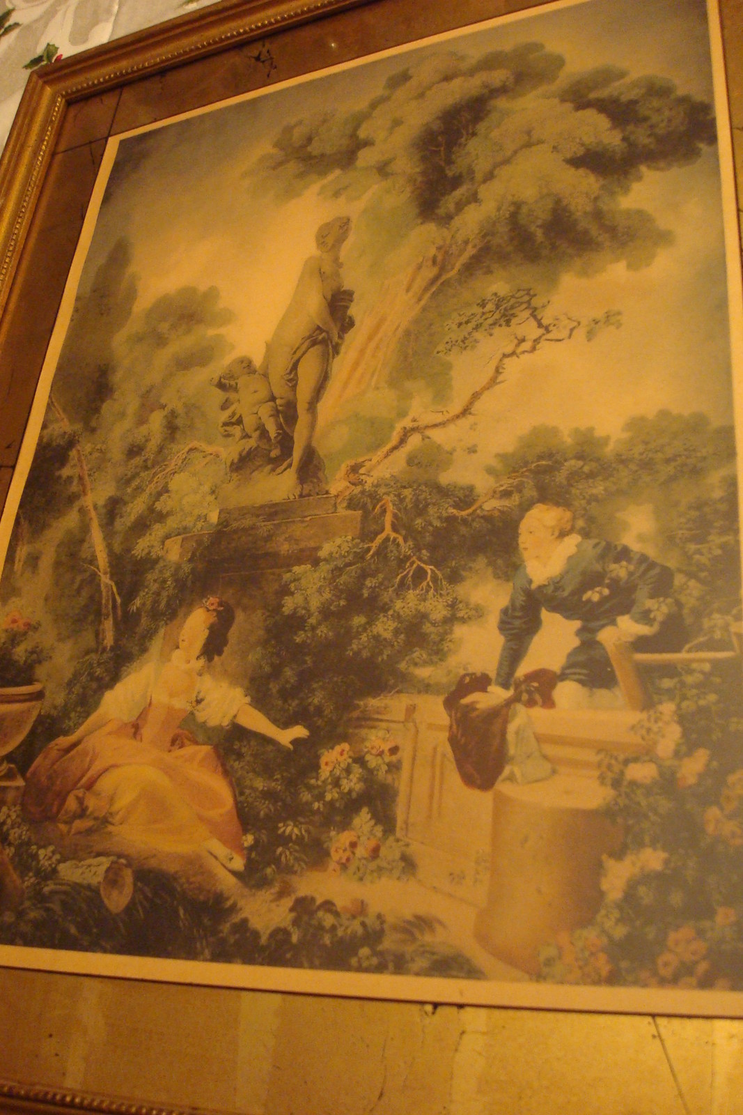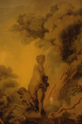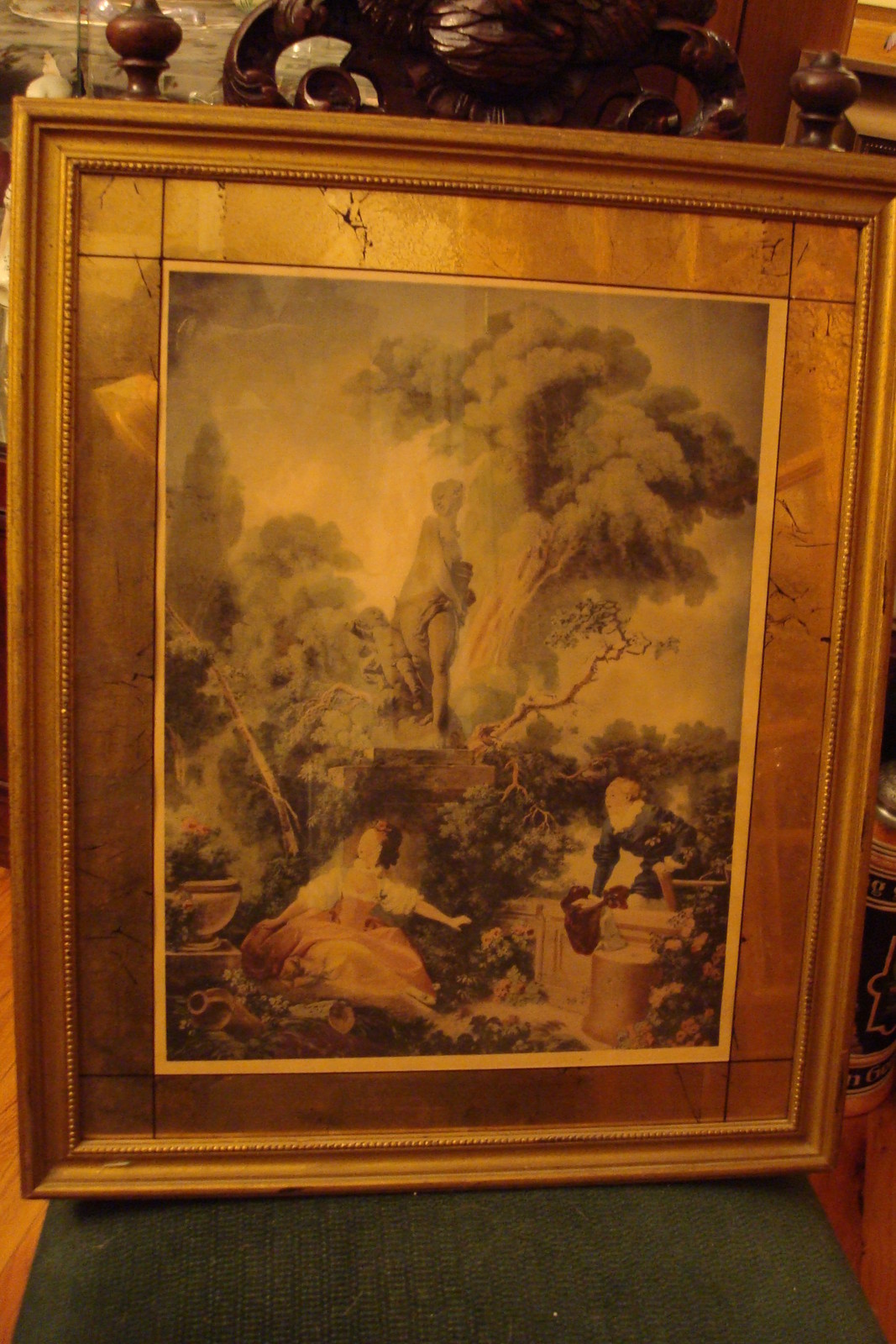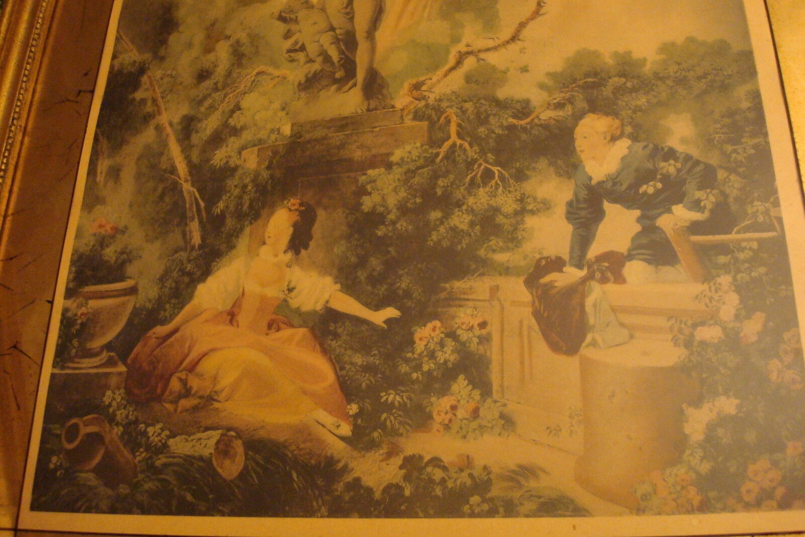 Fragonard, Jean-Honore, "Surprise", New York: E. S. Herrmann, early 20th cent. Color reproduction of original painting. Imprinted "E.S.Herrmann N.Y. on the back. Very good condition, it is framed with a golden border, gold is kind of rustic, I do not know if it is for the age or purposedly done. 22" by 18" total dimension including the frame, area of print in 12 1/2" by 16 1/2".