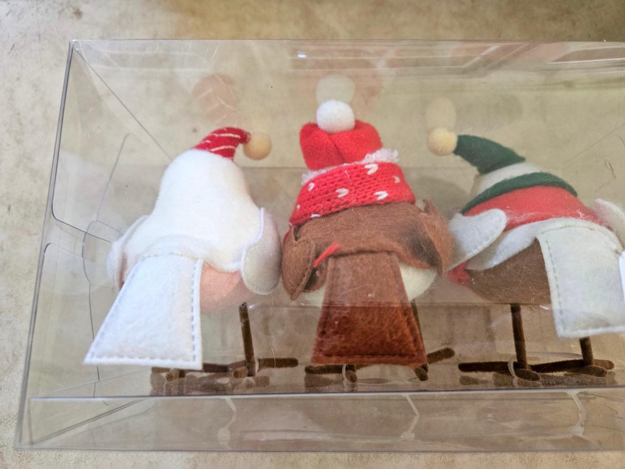 This Christmas figurine set includes three tiny birds dressed in vibrant warm gear ? one with a red pullover and green-striped pointy hat, the second in blush pink wrapped in colorful Christmas lights and wearing a red-striped pointy hat and the third with a red knit scarf and a matching Santa hat.
