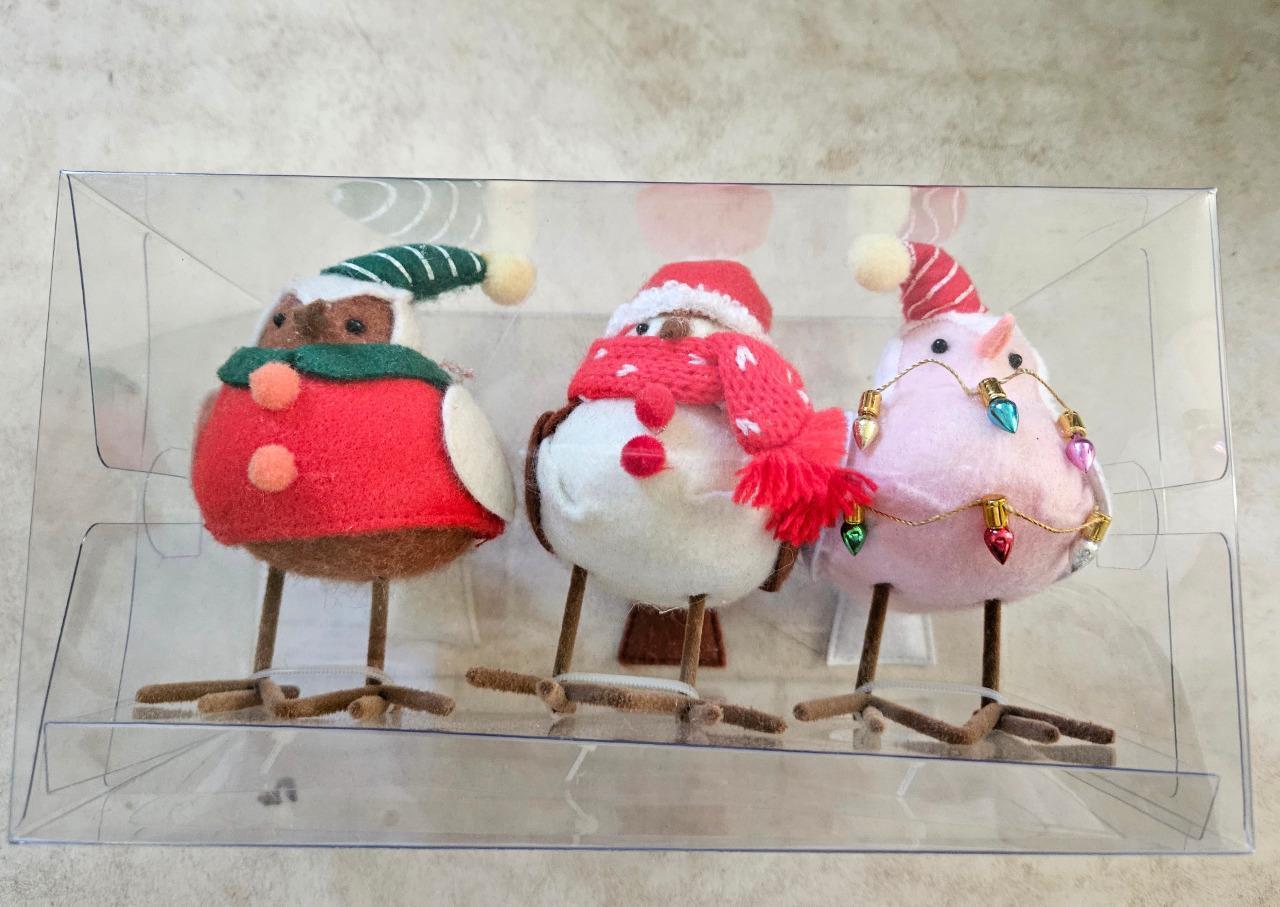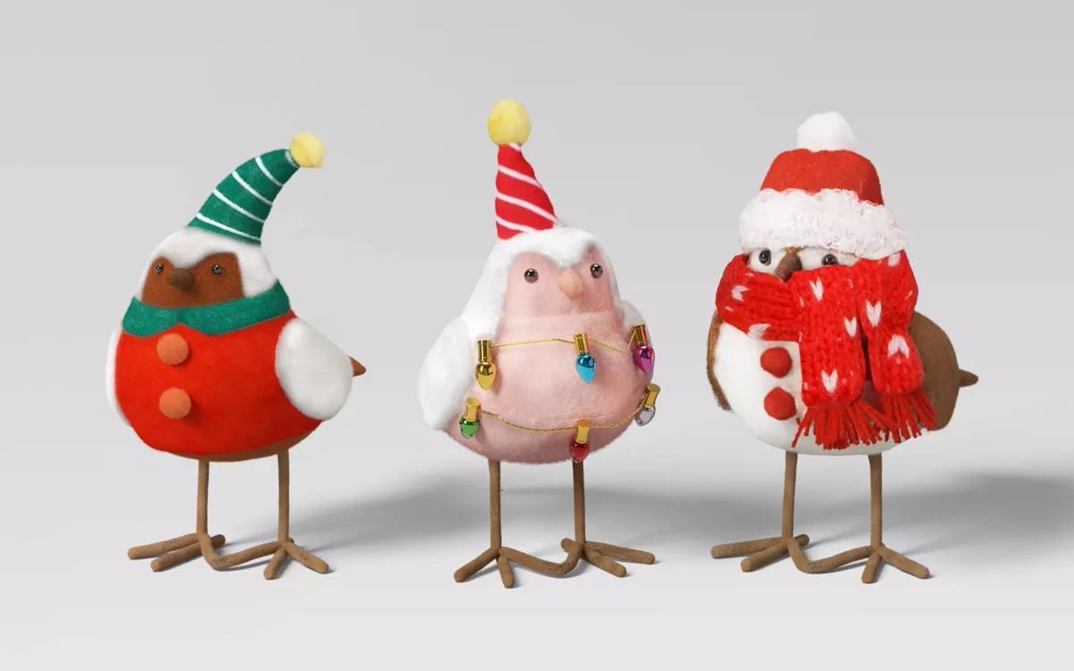 Give your holiday decorations an im-peck-able touch of festive flair with this 3-Piece Featherly Friends Fabric Bird Figurine Set from Wondershop?. This Christmas figurine set includes three tiny birds dressed in vibrant warm gear ? one with a red pullover and green-striped pointy hat, the second in blush pink wrapped in colorful Christmas lights and wearing a red-striped pointy hat and the third with a red knit scarf and a matching Santa hat. Made of soft fabric, these cute bird figurines will add a fun, nature-themed vibe to your festive decor, whether you keep them on your mantel, tabletop, windowsill or around your Christmas tree.