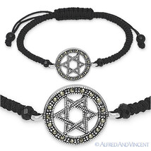 The featured bracelet showcases a finely crafted Star of David circle cast in .925 sterling silver and paved all throughout with marcasite crystals. The charm is then finished with macrame knotted wristbands, accentuated with bead stoppers, fastened with a knotted piece allowing it to be adjusted to fit most wrist sizes.